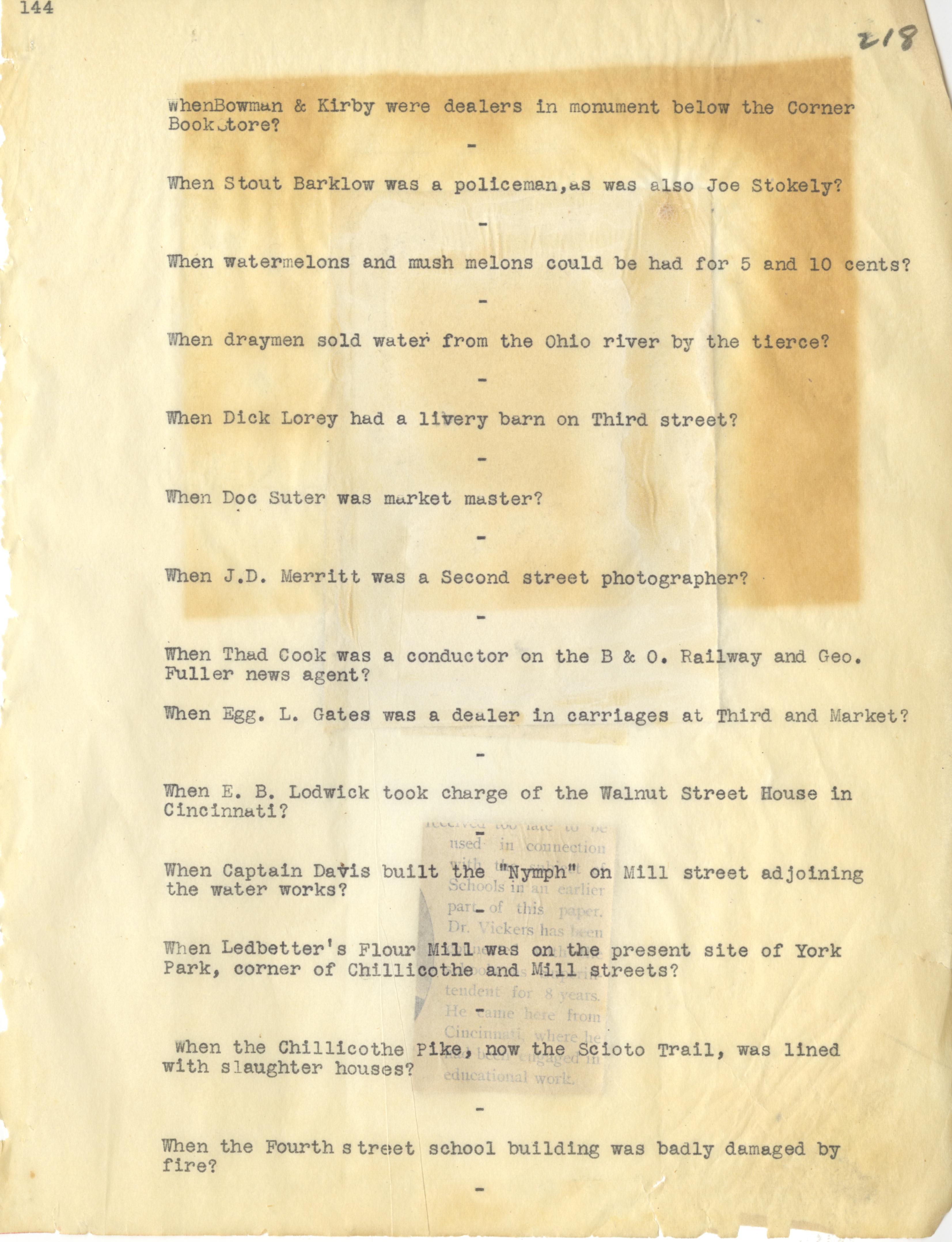 - Photo image of scanned scrapbook page. Pictured typed page from Do you Remember When Continued. Bowman & Kirby; Corner Bookstore; Stout Barklow; Joe Stokely; watermelons; Dick Lorey; Doc Suter; J. D. Merritt; Thaddeus Cook; B & O Railway and George Fuller, news agent; Egg. L. Gates; E. B. Lodwick; Captain Davis built the "Nymph;" Ledbetter's Flour Mill was on present site of York Park; Chillicothe Pike; Scioto Trail; Fourth (4th) Street School damaged by fire
