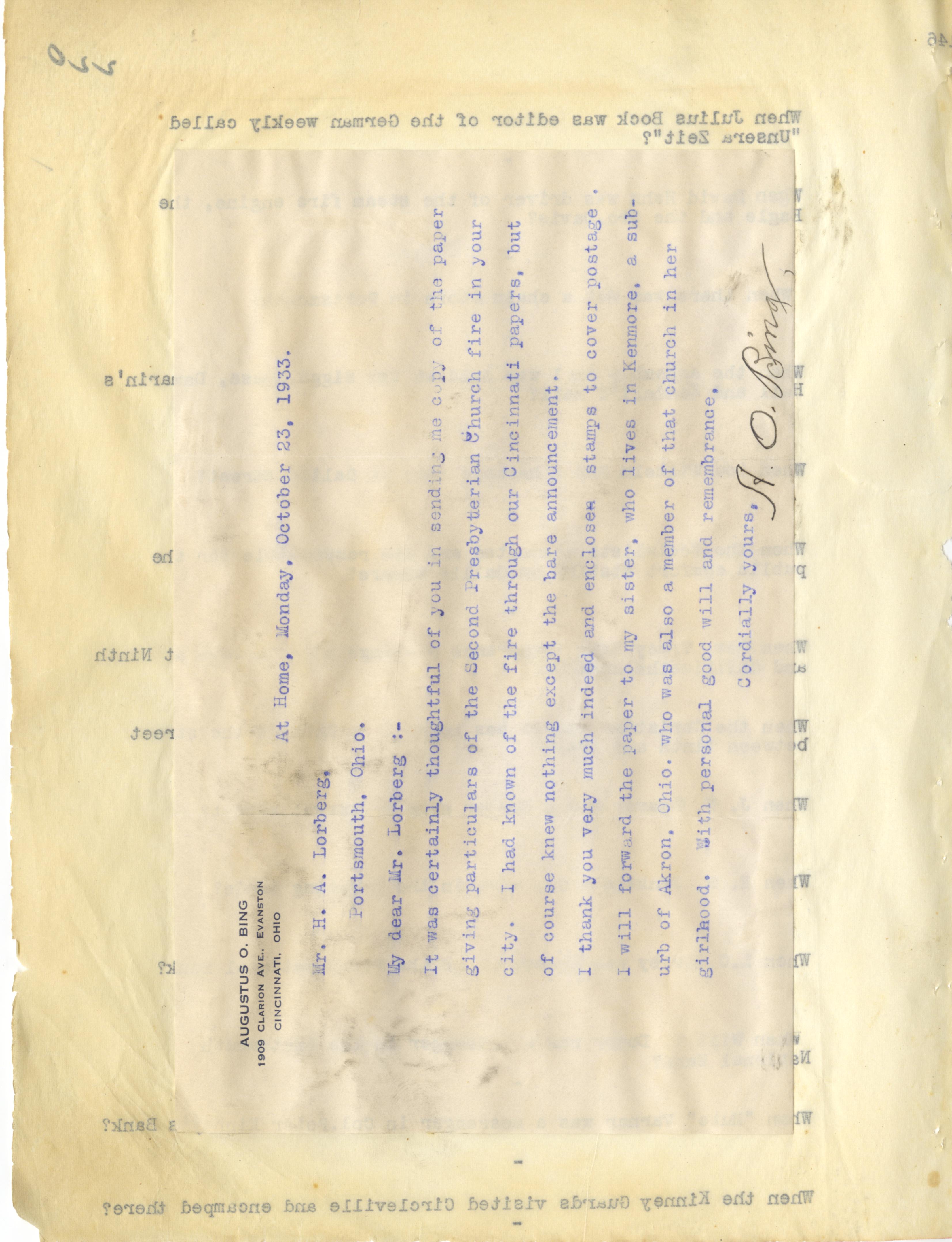 - Photo image of scanned scrapbook page. Pictured: typed letter to H. A. Lorberg from Augustus Bing, dated Monday, October 23, 1933. The letter talks about when Lorberg sent him Portsmouth Times newspaper pages covering the Second Presbyterian Church Fire