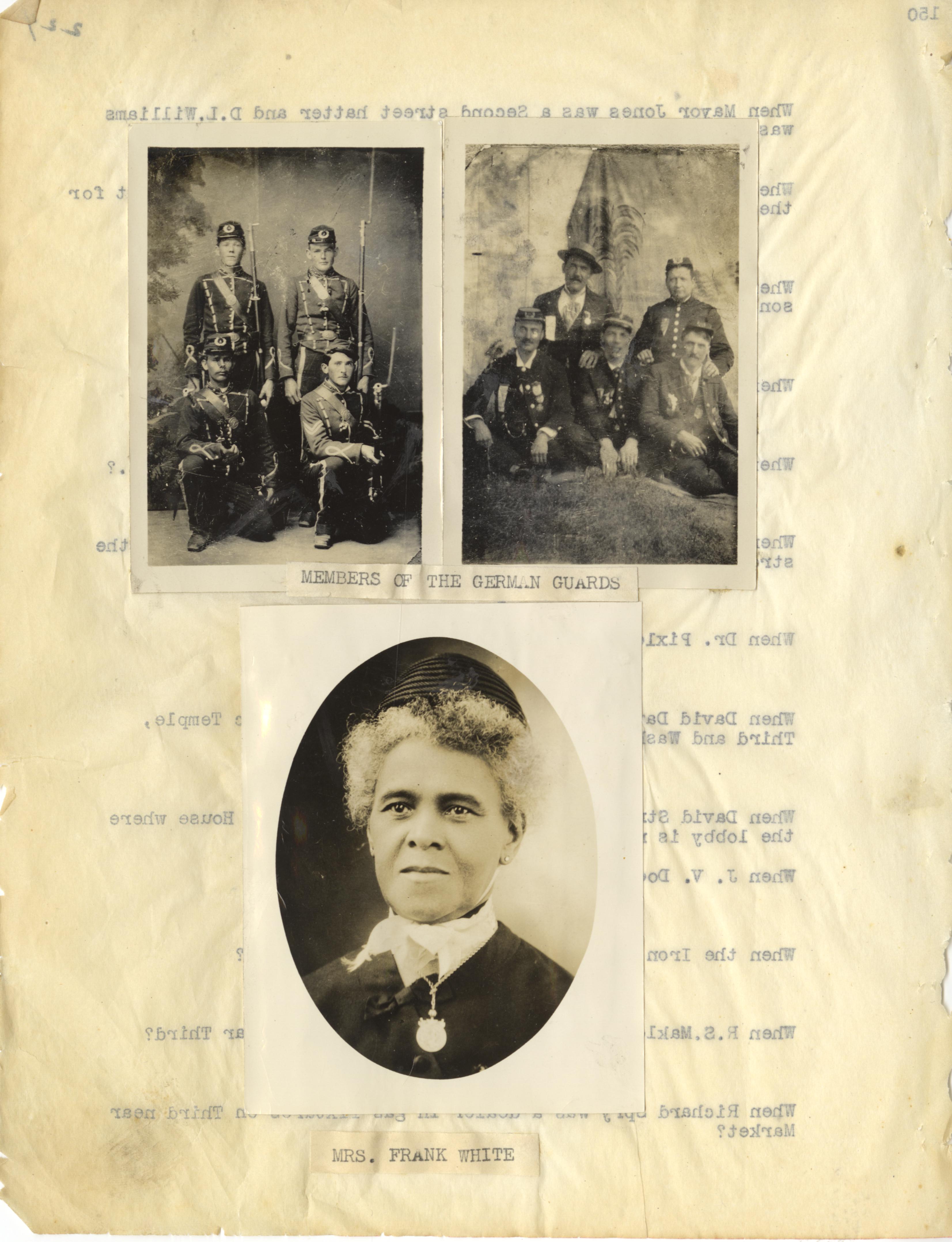 - Photo image of scanned scrapbook page. Pictured: Members of the German Guards; Mrs. Frank White