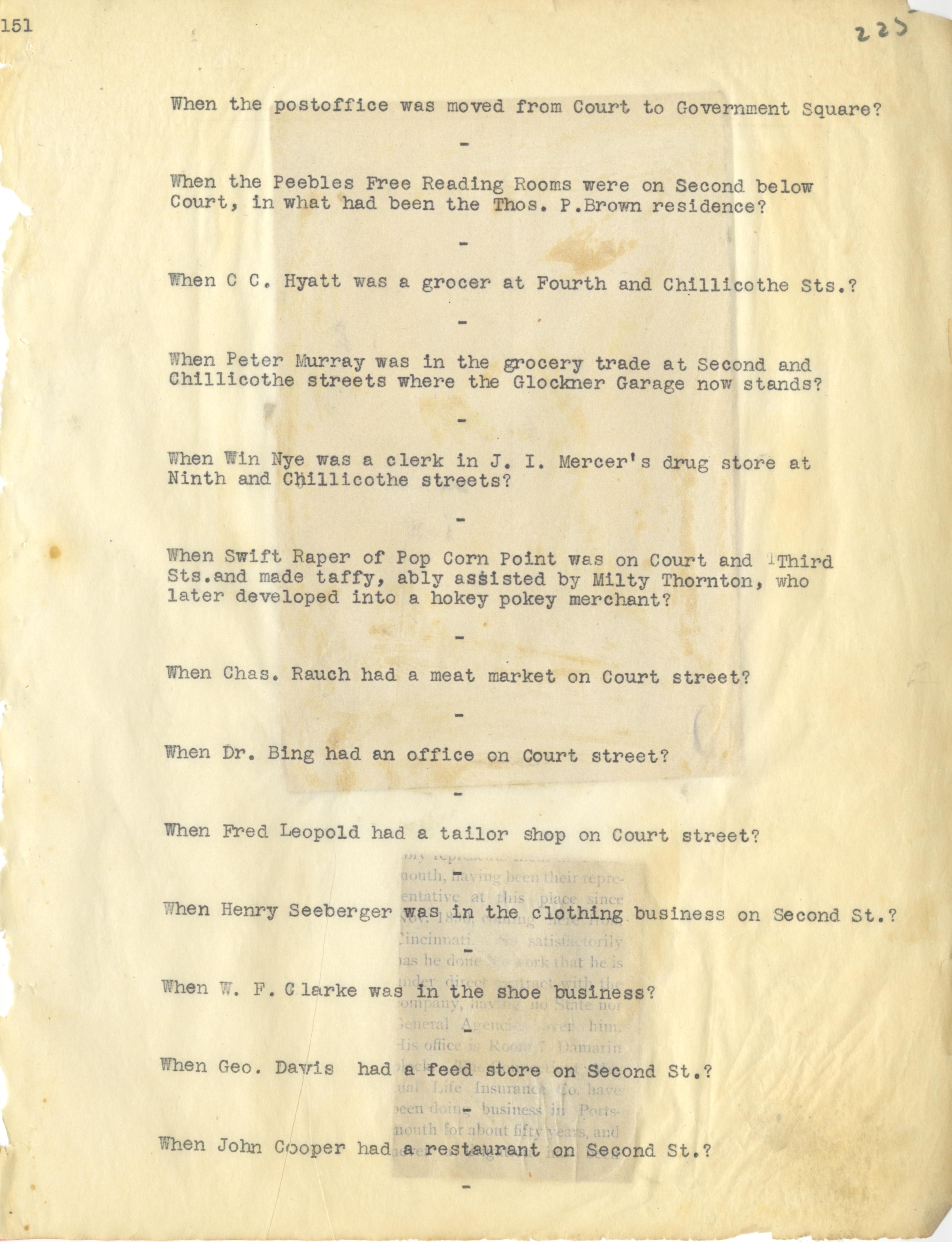 - Photo image of scanned scrapbook page. Pictured: typed page from Do You Remember Continued. post offices moved from Court Street to Government Square; Thomas P. Brown; C. C. Hyatt; Peter Murray; Glockner Garage; Win Nye; J. L. Mercer's drug store; Popcorn Point; Milty Thornton; Charles Rauch; Dr. Bing; Fred Leopold; Henry Seeberger; W. F. C. Clarke; George Davis; John Cooper