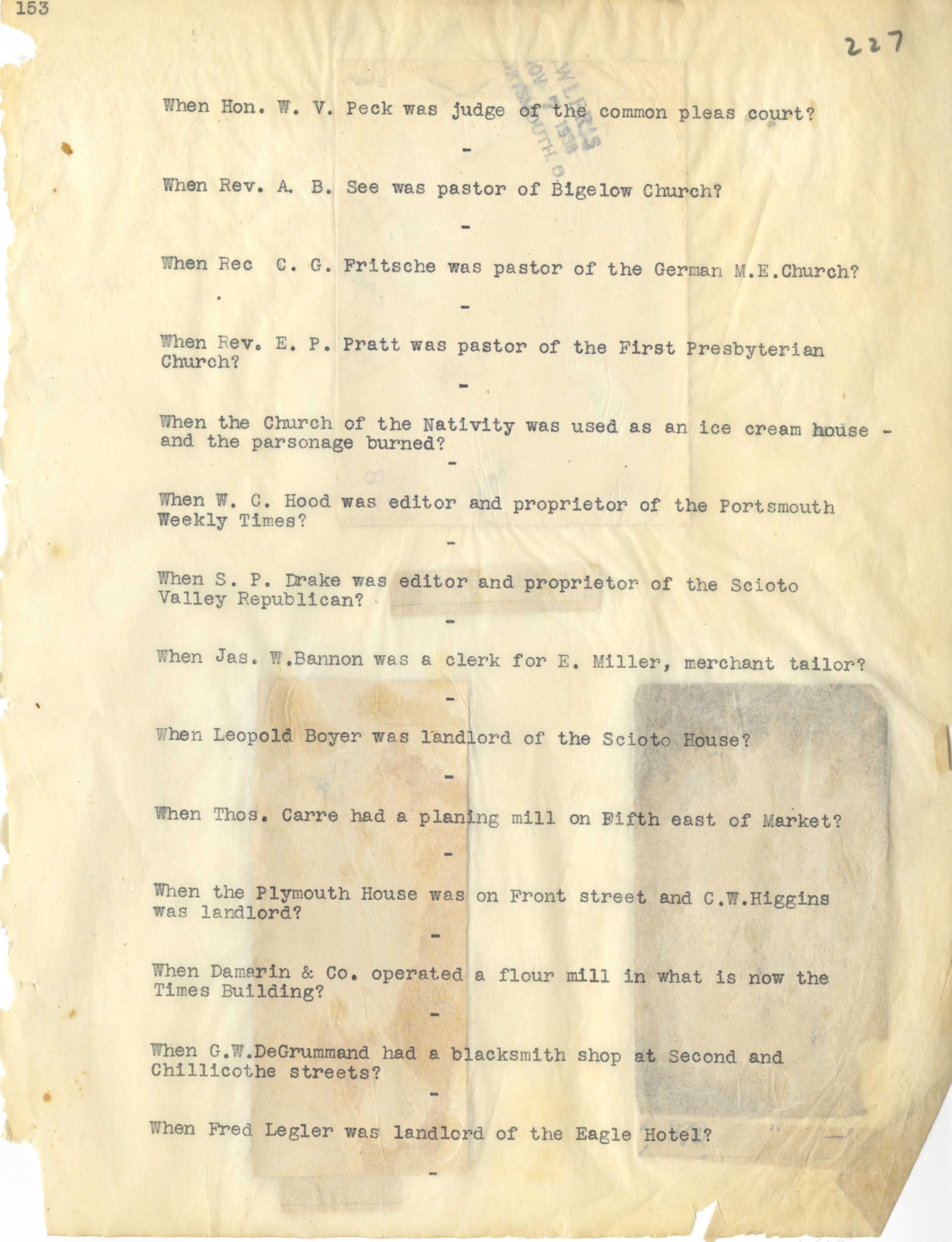 - Photo image of scanned scrapbook page. Pictured: typed page from Do You Remember Continued. Hon. W. V. Peck; Rev. A. B. See; Bigelow Church; C. G. Fritsche; German M. E. Church; Rev. E. P. Pratt; First Presbyterian Church; Church of the Nativity; W. C. hood;S. P. Drake; Scioto Valley Republican; James W. Bannon; E. Miller; Leopold Boyer; Scioto House; Thos. Carre's planing mill; Plymouth House; C. W. Higgins; Damarin & Co.; Times Building; G. W. DeGrummand; Fred Legler, landlord of the Eagle Hotel