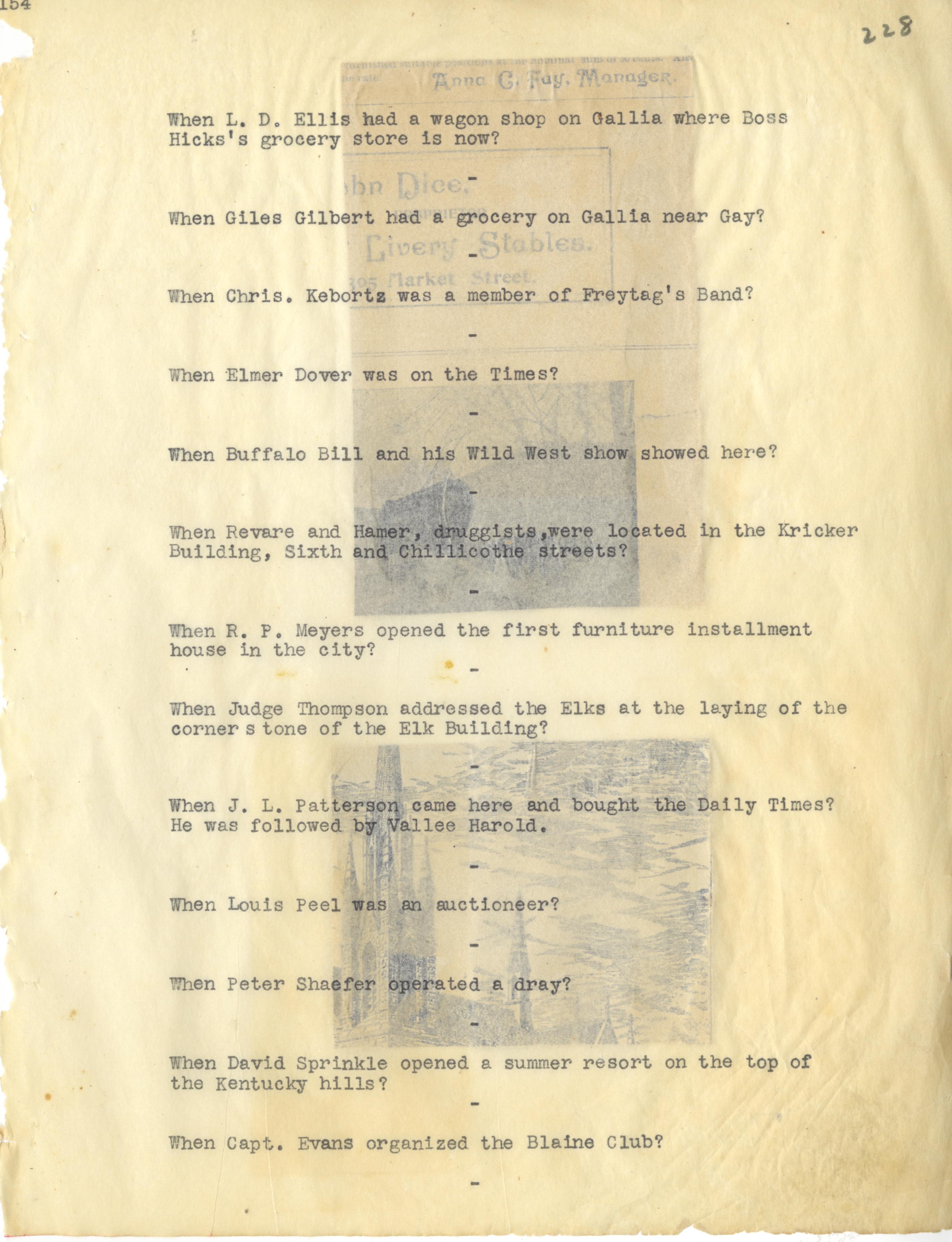 - Photo image of scanned scrapbook page. Pictured: typed page from Do You Remember Continued. L. D. Ellis; Boss Hick's Grocery Store; Giles Gilbert; Chris Kebortz; Freytag's Band; Elmer Dover; Buffalo Bill's Wild West Show; Revare and Hamer; Kricker Building; R. P. Meyers; Elks Building; J. L. Patterson; Daily Times; Vallee Harold; Louis Peel; Peter Shaefer; David Sprinkle; Capt. Evans; Blaine Club