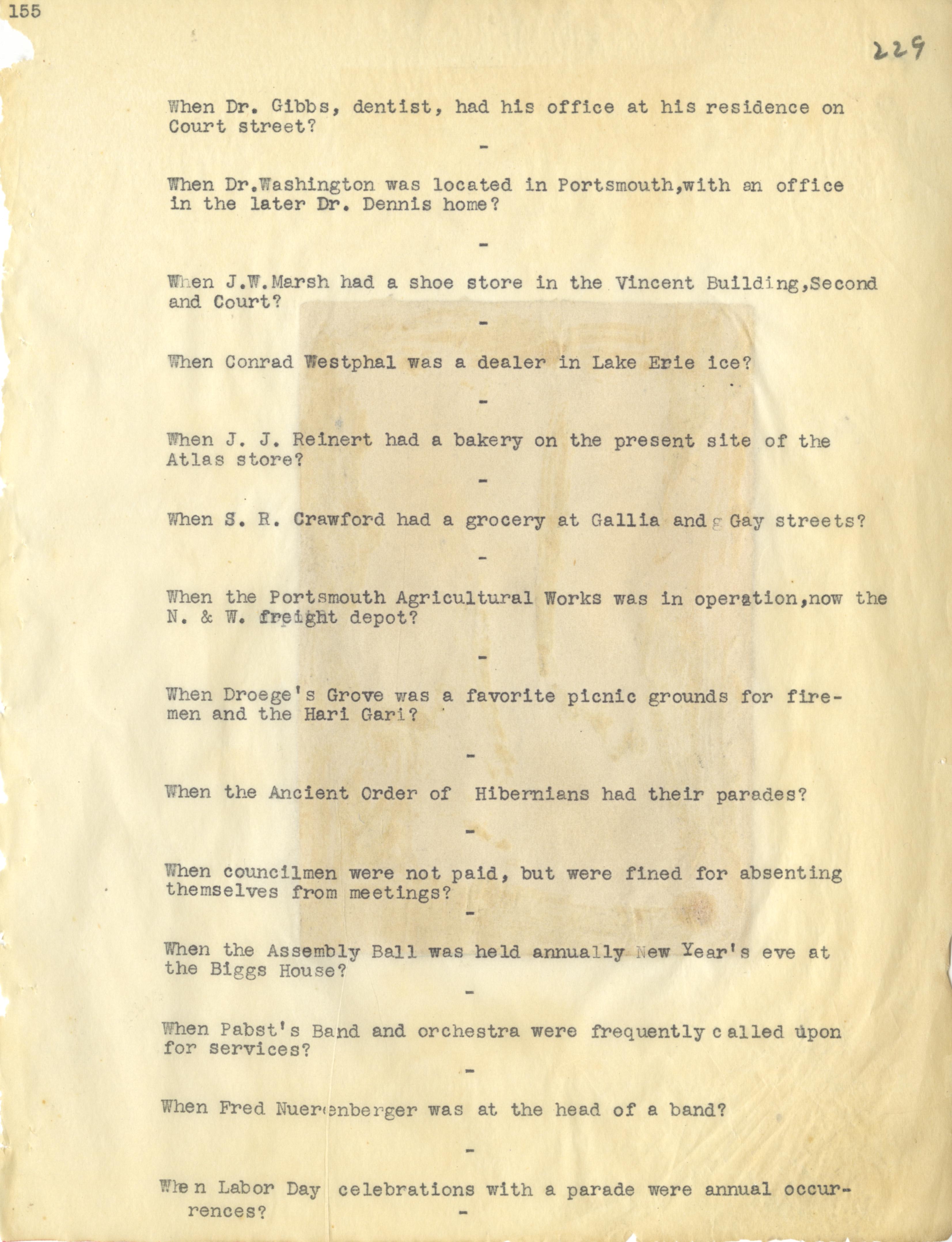- Photo image of scanned scrapbook page. Pictured: Do You Remember Continued. Dr. Gibbs; Dr. Washington; Dr. Dennis; J. W. Marsh; Vincent Building; Conrad Westphal; J. J. Reinert; S. R. Crawford; Portsmouth Agricultural Works; N & W Freight Depot; Droege's Grove; Hari Gari; Ancient Order of Hibernians; Assembly Ball; Biggs House; Pabst's Band; Fred Nuerenberger; Labor Day