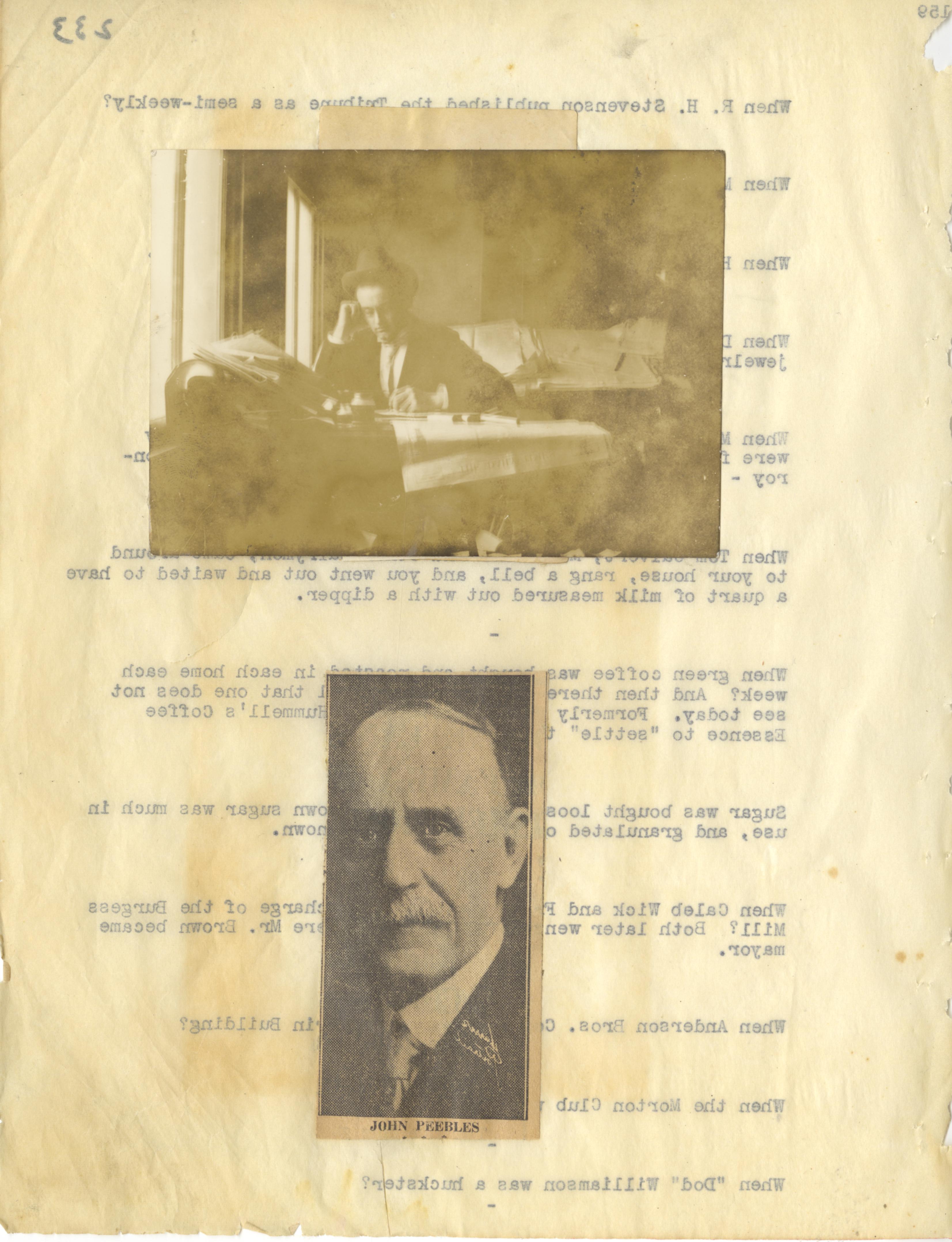 - Photo image of scanned scrapbook page. Pictured: newspaper photo of John Peebles