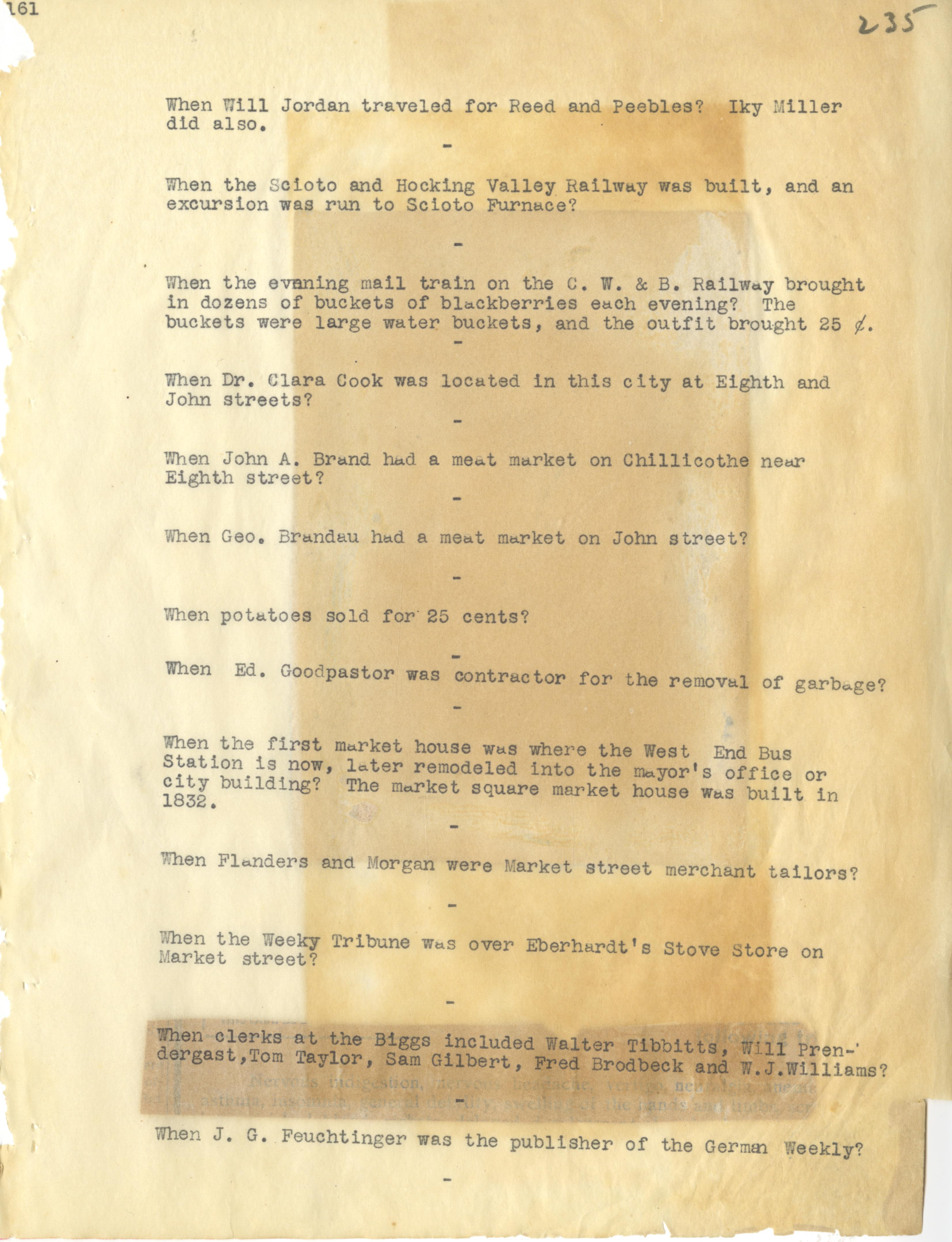 - Photo image of scanned scrapbook page. Pictured: typed page from Do You Remember Continued. Will Jordan; Iky Miller; Sciolto and Hocking Valley Railway; Scioto Furnace; C. W. &. B. Railway; Dr. Clara Cook; John A. Brand; George Brandau; Edward Goodpastor; End Bus Station; Flanders and Morgan Tailors; Weekly Tribune; Eberhardt's Stove Store; Biggs House Clerks: Walter Tibbitts; Will Prendergast; Tom Taylor; Sam Gilbert; Fred Brodbeck; W. J. Williams; J. G. Feuchtinger, publisher of the German Weekly