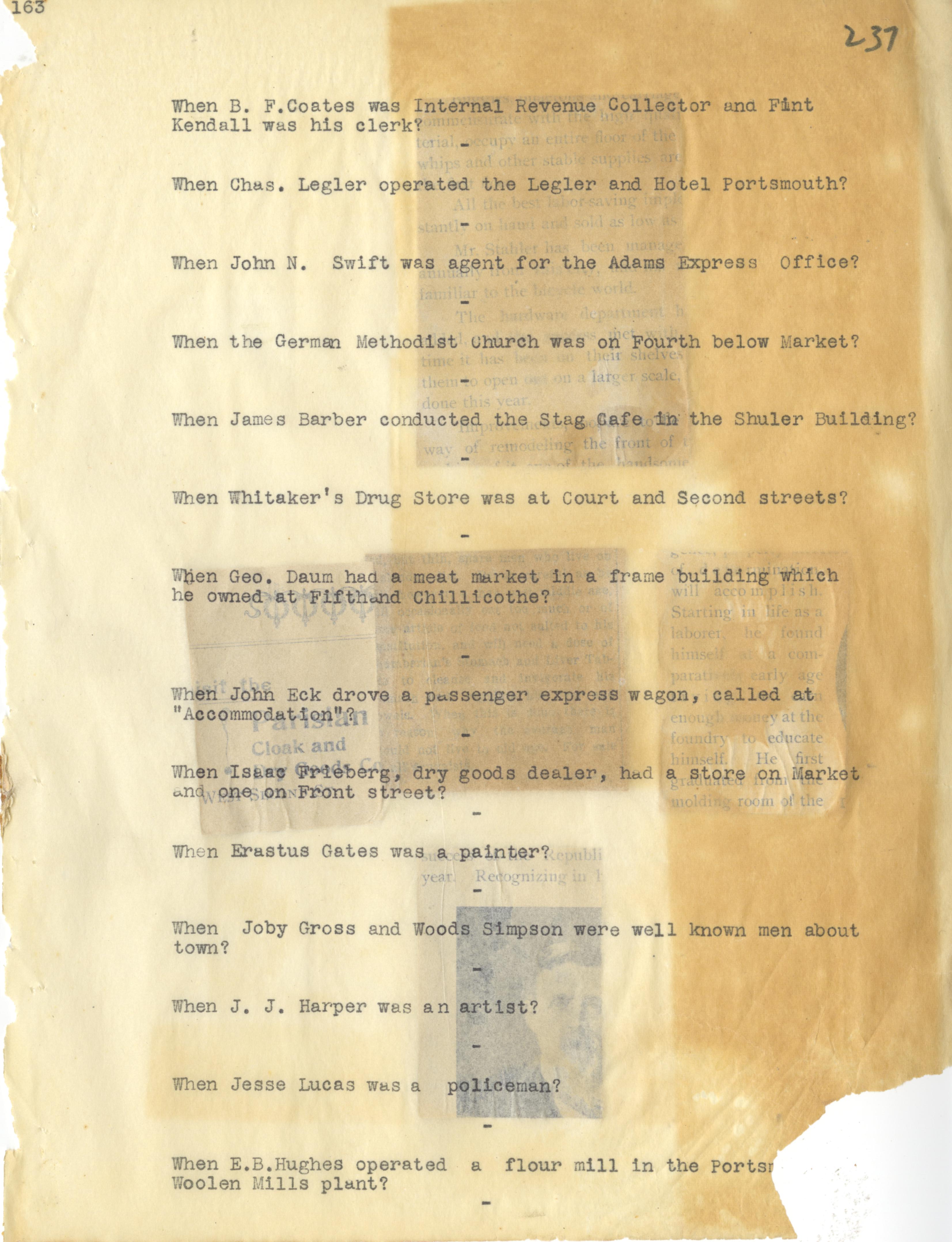 - Photo image of scanned scrapbook page. Pictured: typed page from Do You Remember Continued. B. F. Coates; Internal Revenue Collector; Fint Kendall; Chas. Legler; Legler Hotel; John N. Swift; Adams Express Office; German Methodist Church; James Barber; Stag Cafe in the Shuler Building; Whitaker's Drug Store; George Daum's meat market; John Eck; Isaac Frieberg; Erastus Gates; Joby Grossl Woods Simpson; J. J. Harper; Jesse Lucas; E. B. Hughes; Portsmouth Woolen Mills Plant