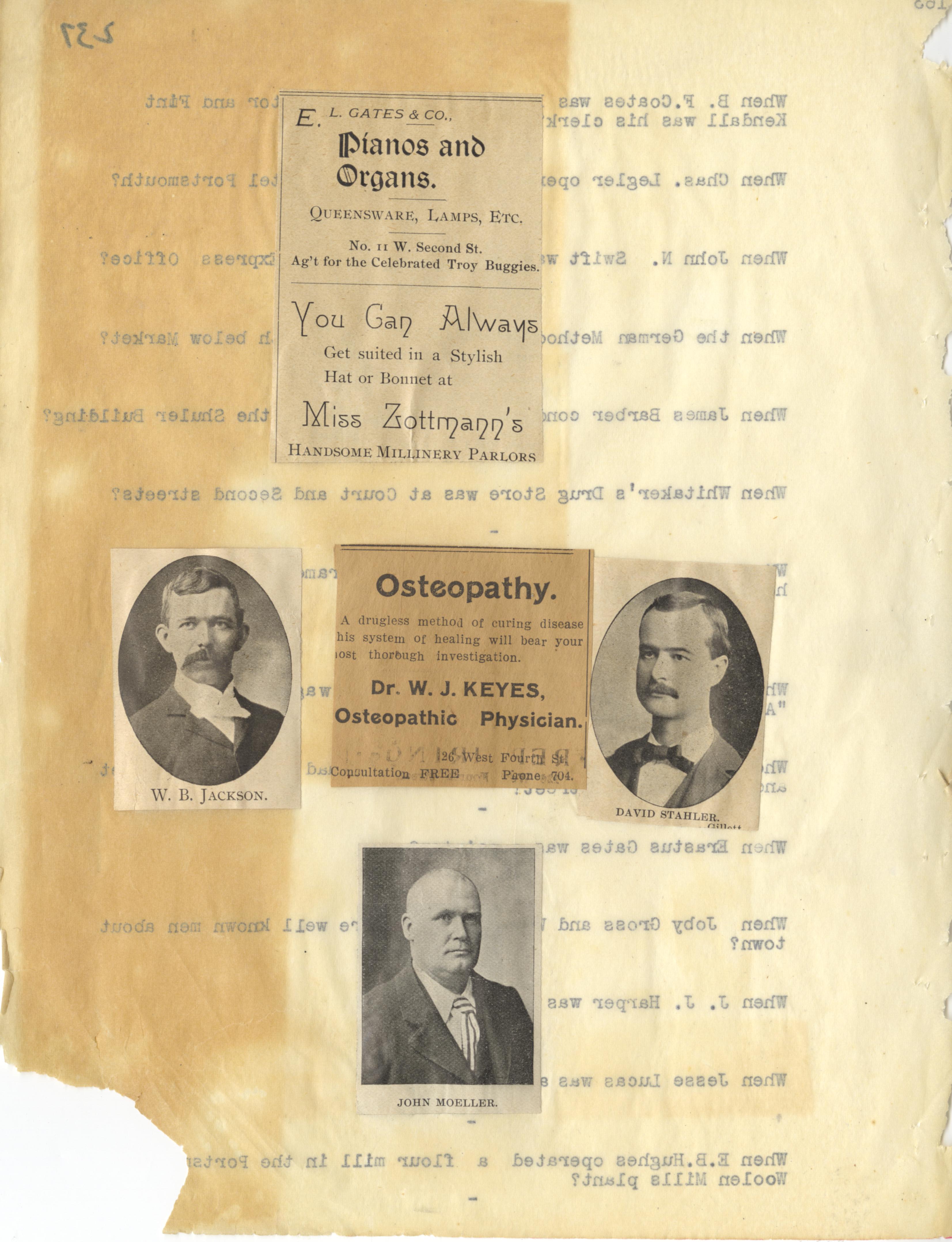 - Photo image of scanned scrapbook page. Pictured: W. B. Jackson; David Stahler; John Moeller; Ad for E. L. Gates Pianos and Organs at No. 11 West Second (2nd) Street; Ad for Dr. W. J. Keyes, Osteopathic Physician at 26 West Fourth (4th) Street