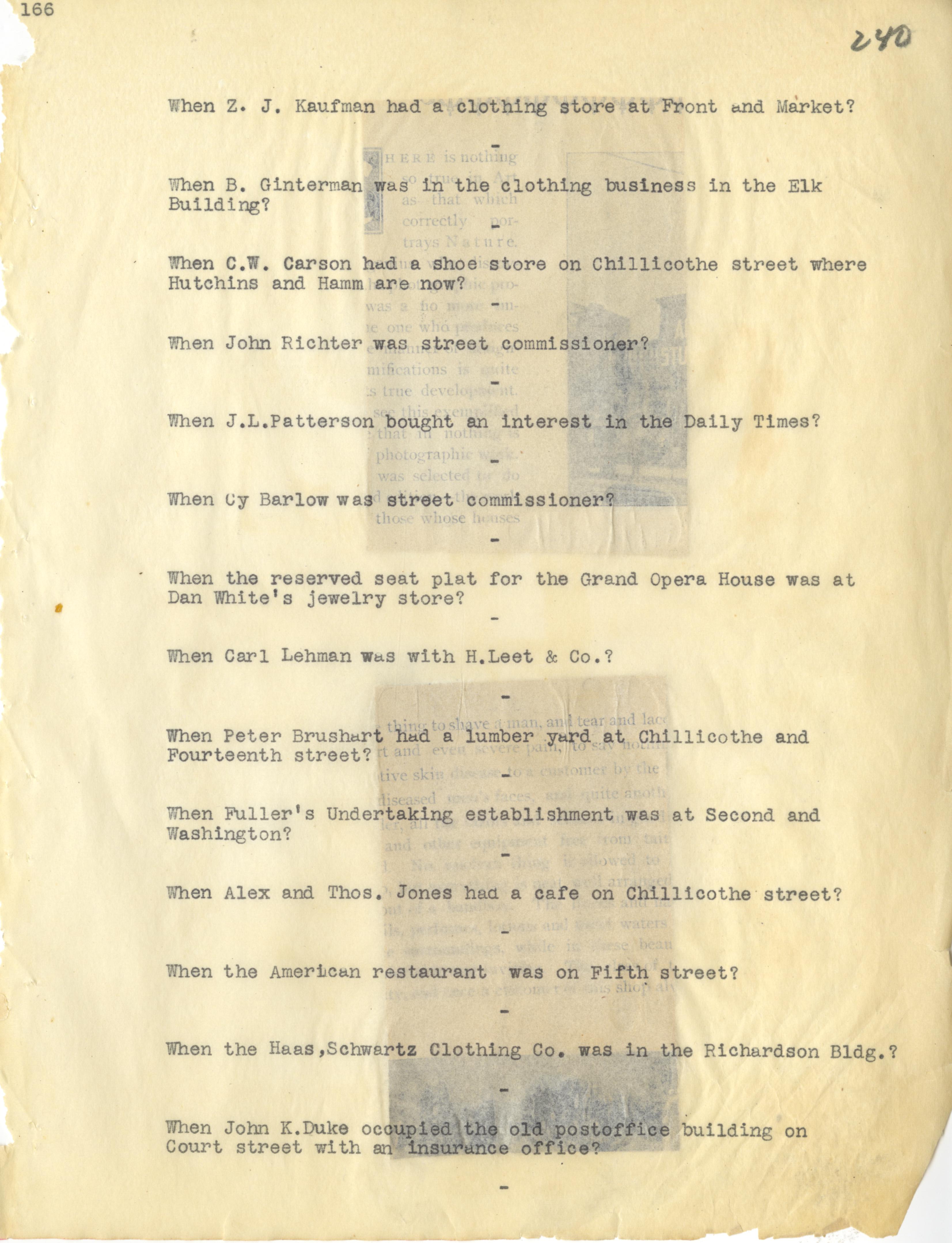 - Photo image of scanned scrapbook page. Pictured: typed page from Do You Remember Continued. Z. J. Kaufman; B. Ginterman; Elk Building; C. W. Carson; John Richter; J. L. Patterson; Daily Times; Cy Barlow; Grand Opera House; Dan White's jewelry store; Carl Lehmal H. Leet & Co.; Peter Brushart; Fuller's Undertaking; Alex and Thos. Jones; American Restaurant; Haas, Schwartz Clothing Co.; Richardson Building; John K. Duke