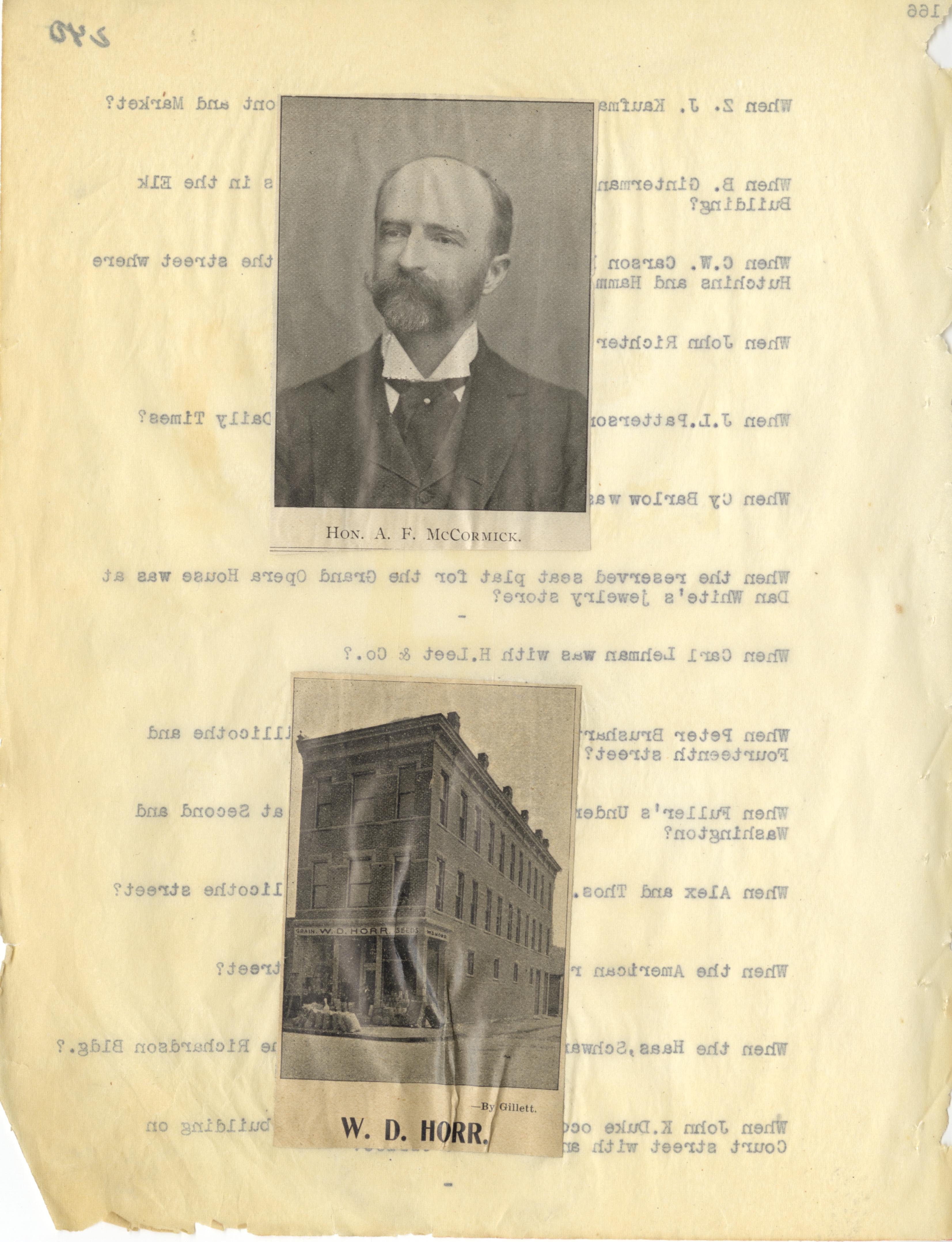 - Photo image of scanned scrapbook page. Pictured: Hon. A. F. McCormick; W. D. Horr, grain and feed store on Gallia Street