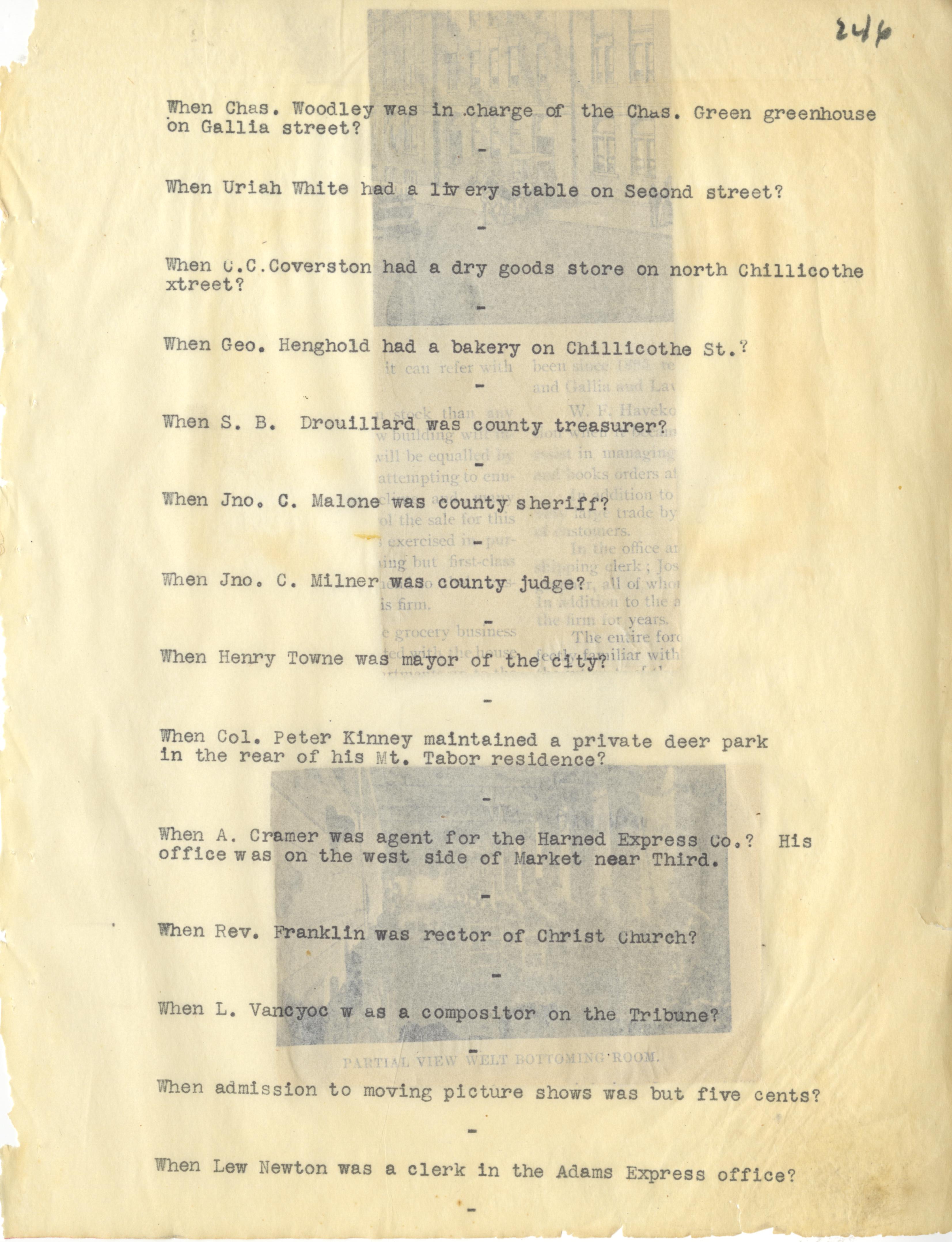 - Photo image of scanned scrapbook page. Pictured: Charles Woodley; Charles Greenhouse; Uriah White; C. C. Coverston; George Henghold; S. B. Drouillard; John C. Malone; John C. Milner; Henry Towne; Col. Peter Kinney residence on Mt. Tabor; A. Cramer; Harned Express Co.; Rev. Franklin; Christ Church; L. Vancyoc; Tribune; Lew Newton; Adams Express Office
