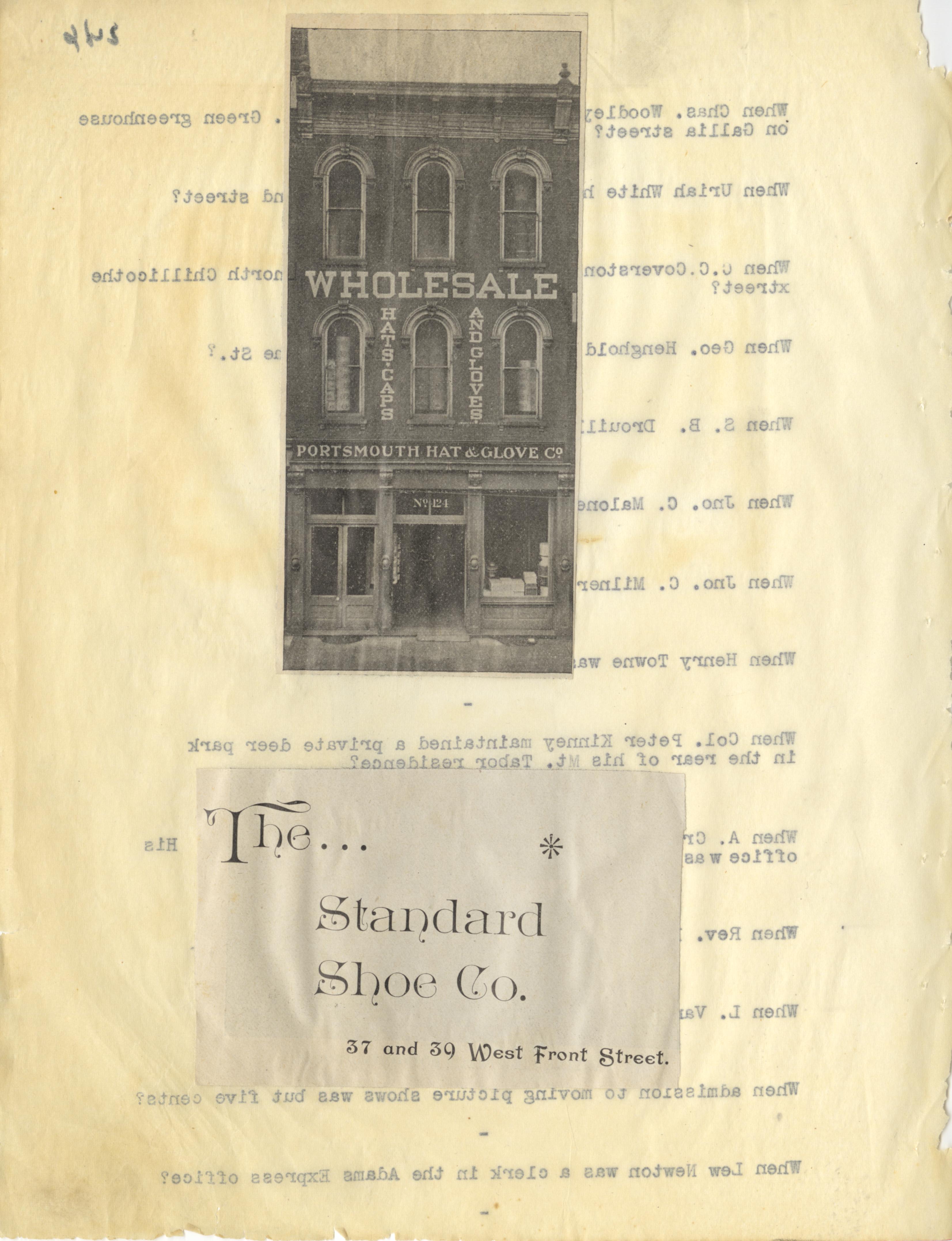 - Photo image of scanned scrapbook page. Pictured: Portsmouth Hat & Glove Company; Ad for the Standard Shoe Co. at 37 and 39 West Front Street