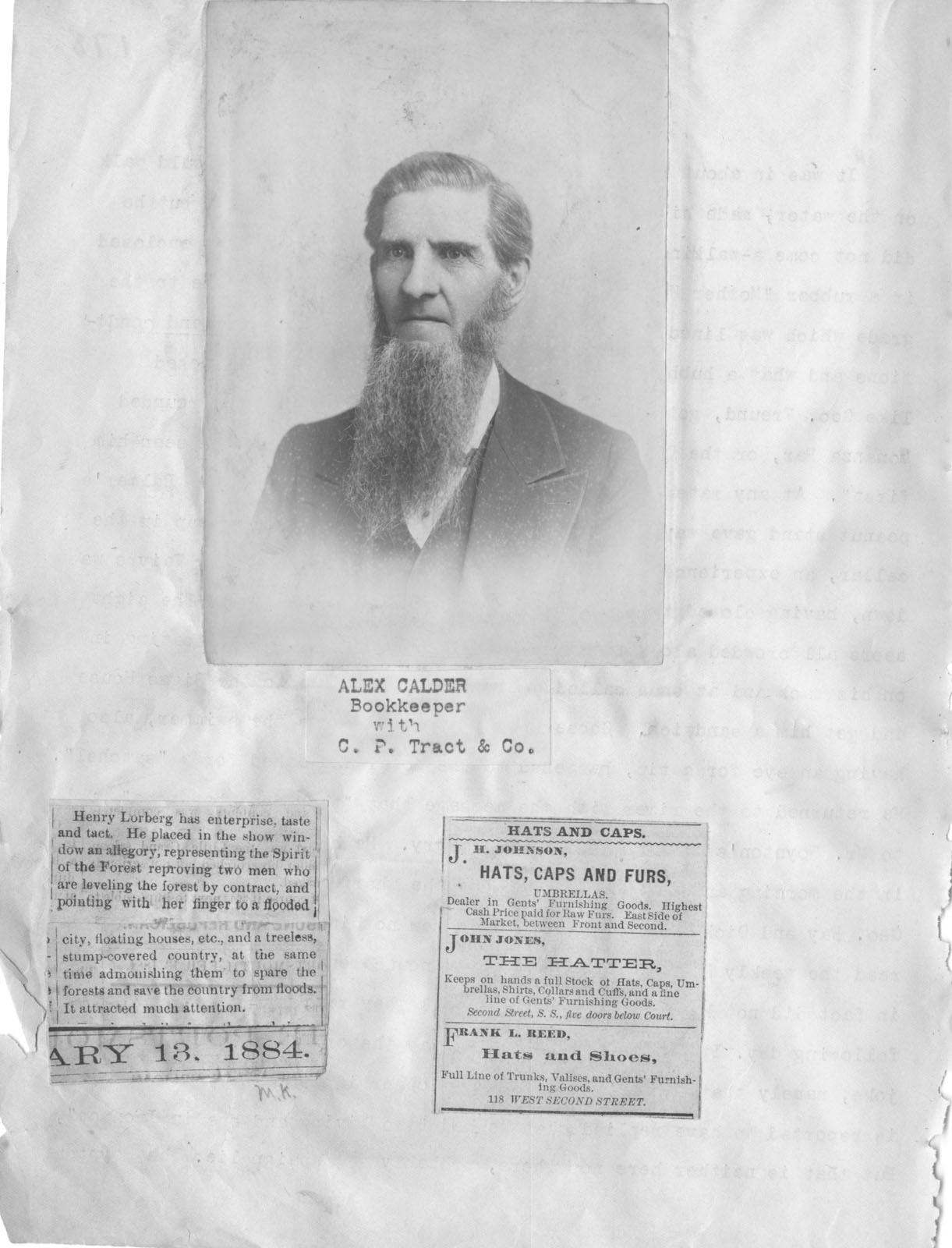 - Scanned unnumbered page from Henry A. Lorberg scrapbook containing black & white image of Alex Calder, Bookkeeper with C. P. Tract & Co.; a newspaper clipping about Henry Lorberg; and clipped ads for J.H. Johnson, Hats, Caps and furs; john Jones, The Hatter; and Frank L. Reed, Hats and Shoes.