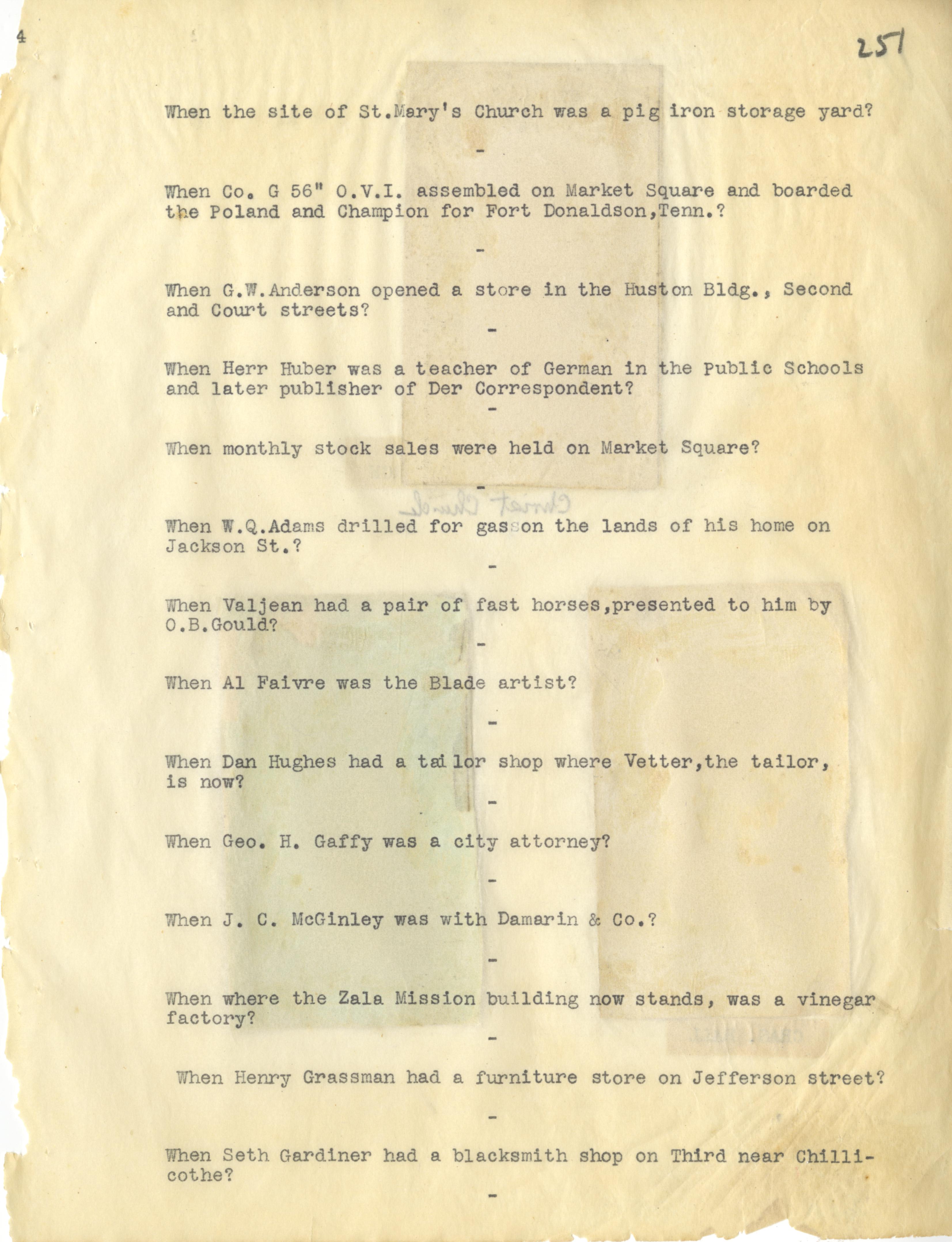 - Photo image of scanned scrapbook page. Pictured: typed page from Do You Remember Continued. St. Mary's Church; pig iron; Co. G 56th O. V. I. in Market Square; G. W. Anderson; Huston Building; Harr Huber; Der Correspondent; W. Q. Adams; Valjean; O. B. Gould; Al Faivre; Dan Hughes; Vetterl George H. Gaffy; J. C. McGinley; Zala Mission Building; vinegar factory; Henry Grassman; Seth Gardiner