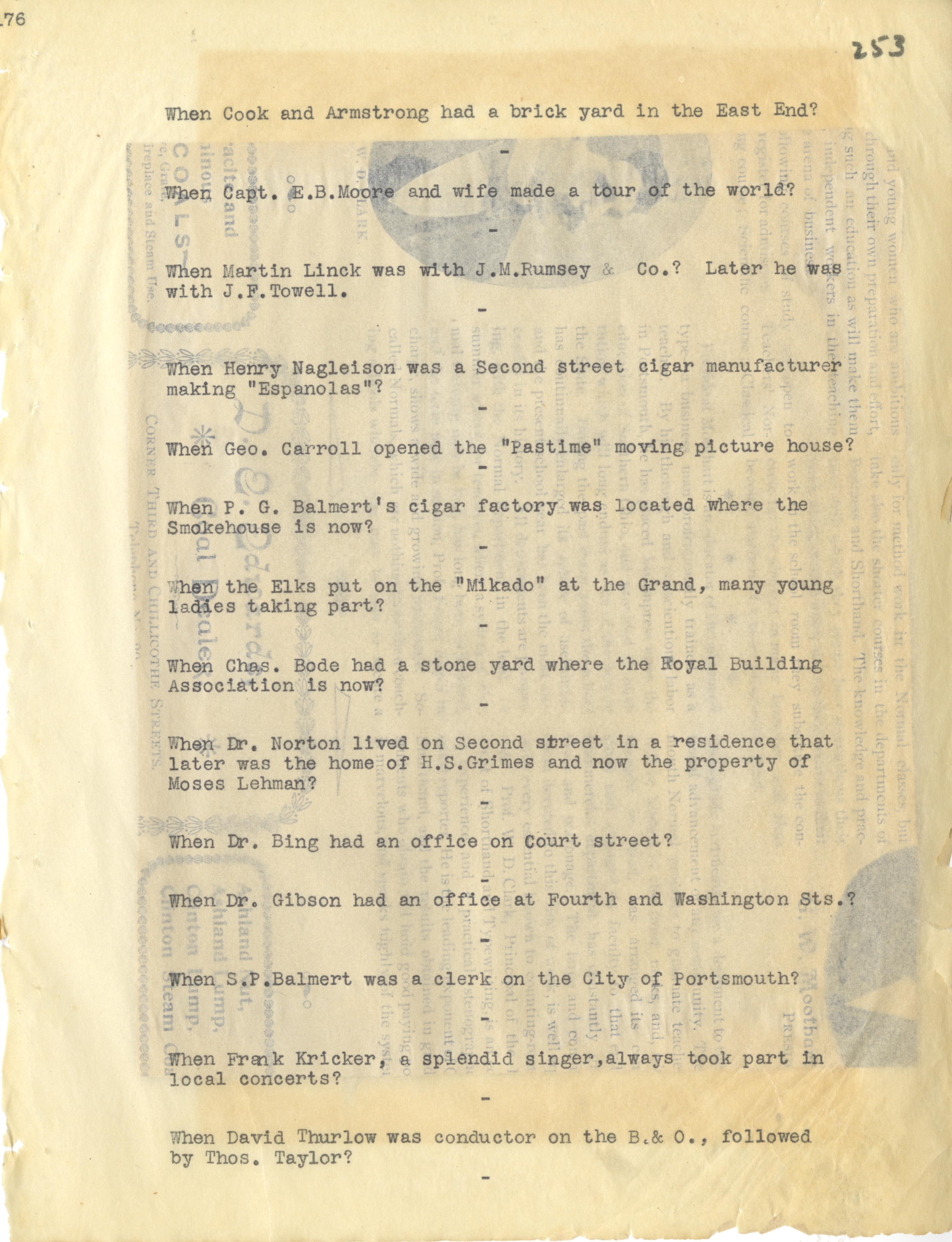 - Photo image of scanned scrapbook page. Pictured: typed page from Do You Remember Continued. Cook and Armstrong; Capt. E. B. Moore; Martin Linck; J. M. Rumsey & Co.; J. F. Towell; Henry Nageison; Geo. Carroll; P. G. Balmert's cigar factory; Smokehouse; Chas. Bode; Royal Building Association; Dr. Norton; H. S. Grimes; Moses Lehman; Dr. Bing; Dr. Gibson; S. P. Balmert; Frank Kricker; David Thurlow; B & O; Thomas Taylor