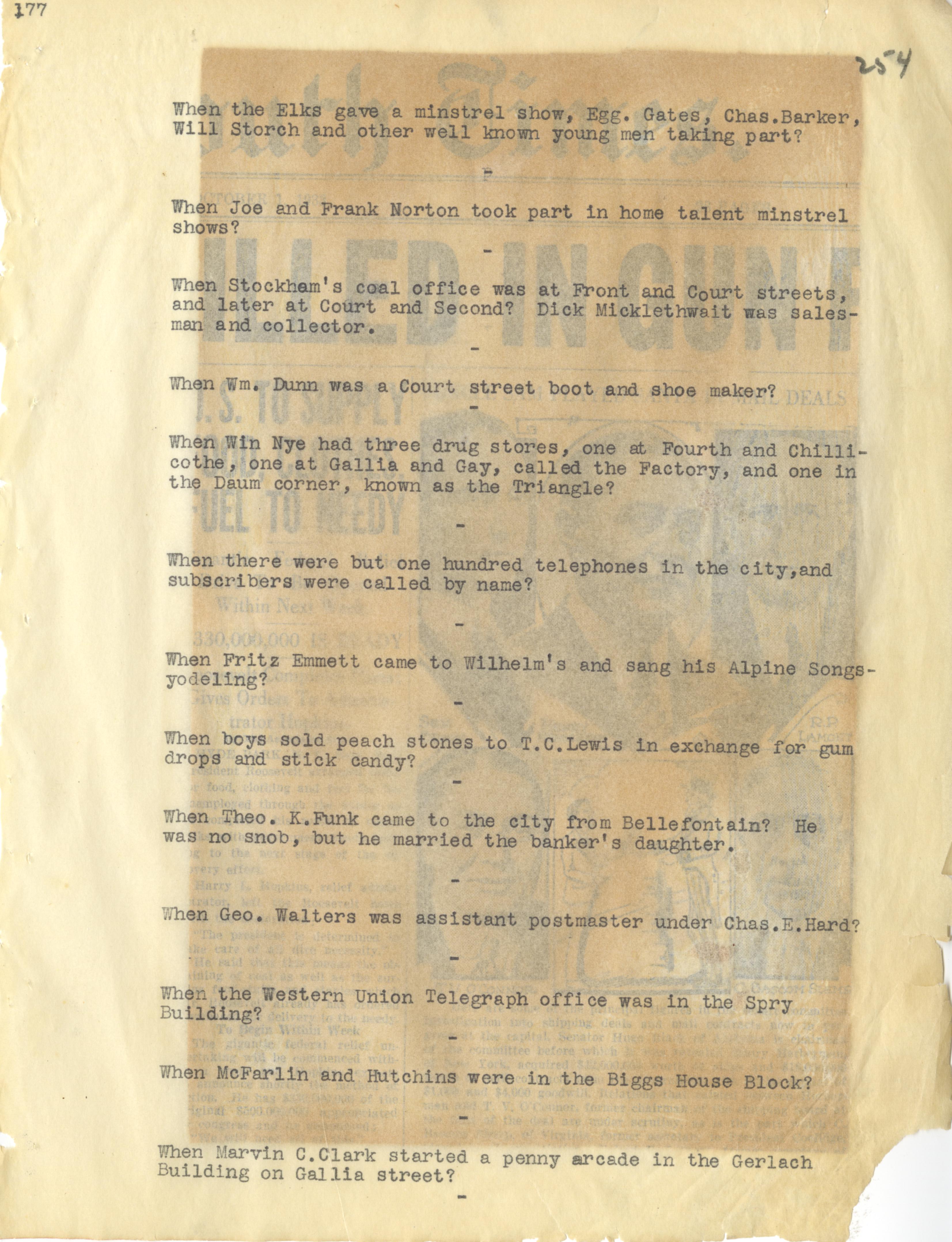 - Photo image of scanned scrapbook page. Pictured: typed page from Do You Remember Continued. Elks; Egg. Gates; Charles Barker; Will Storch; Joe and Frank Norton; Stockham's Coal Office; Dick Micklethwait; William Dunn; Win Nye; Daum Corner; The Triangle; telephones; Fritz Emmett; Wilhelm's; Alpine Songs-yodeling; Theodore K. Funk; Bellefontain; T. C. Lewis; George Walters; Western Union Telegraph; Spry Building; McFarlin and Hutchins; Biggs House Block; Marvin C. Clark; Gerlach Building