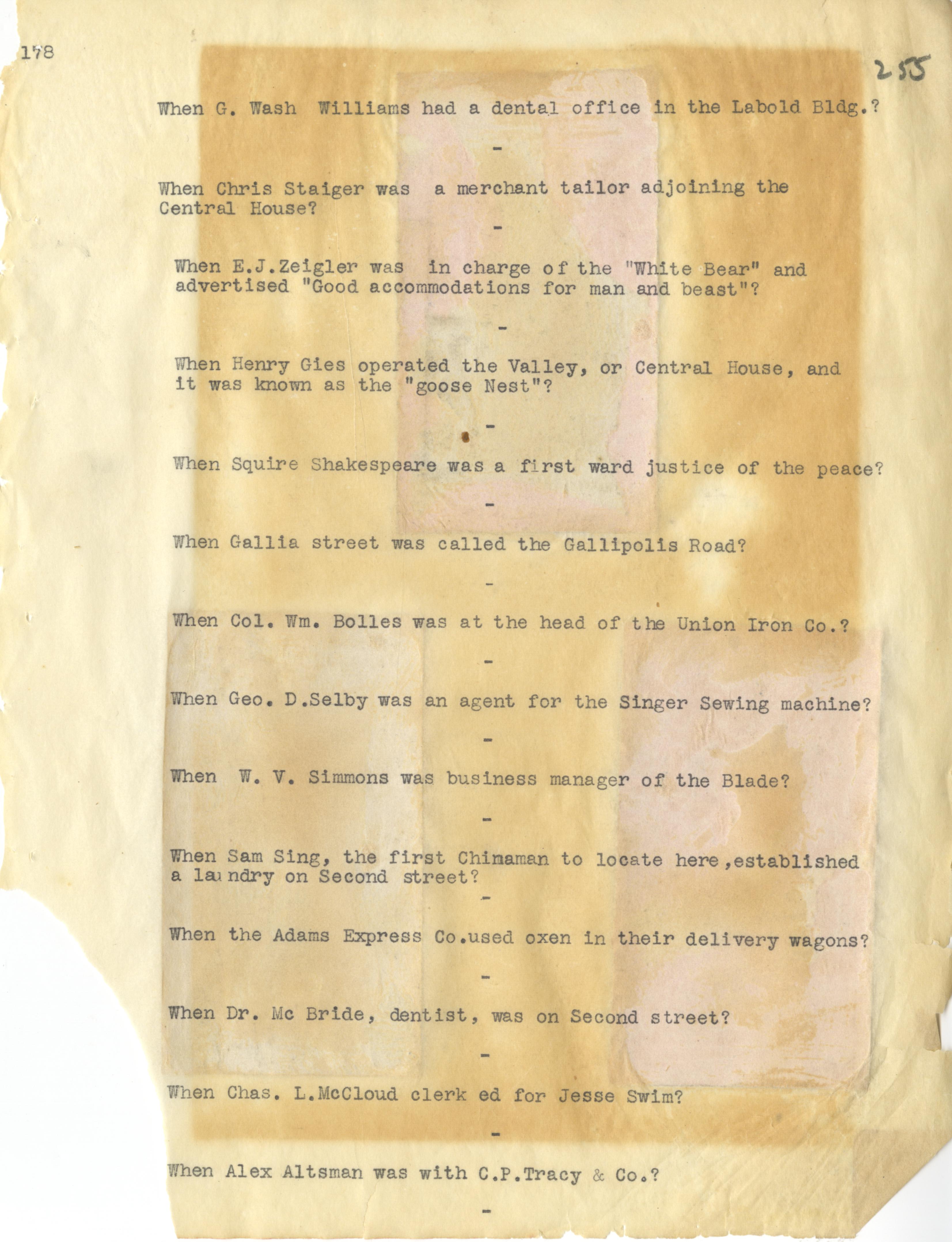 - Photo image of scanned scrapbook page. Pictured: typed page from Do You Remember Continued. G. Wash. Williams; Labold Building; Chris Staiger; Central House; E. J. Zeigler; White Bear Hotel; Henry Gies; the Valley; Squire Shakespeare; Gallia Street was called Gallipolis Road; Col. W. V. Simmons, manager of the Blade; Geo. d. Selby; Singer Sewing machine; Sam Sing, first Chinaman here; Adams Express Co.; Dr. McBride; Charles L. McCloud; Jesse Swim; Alex Altsman; C. P. Tracy & Co.