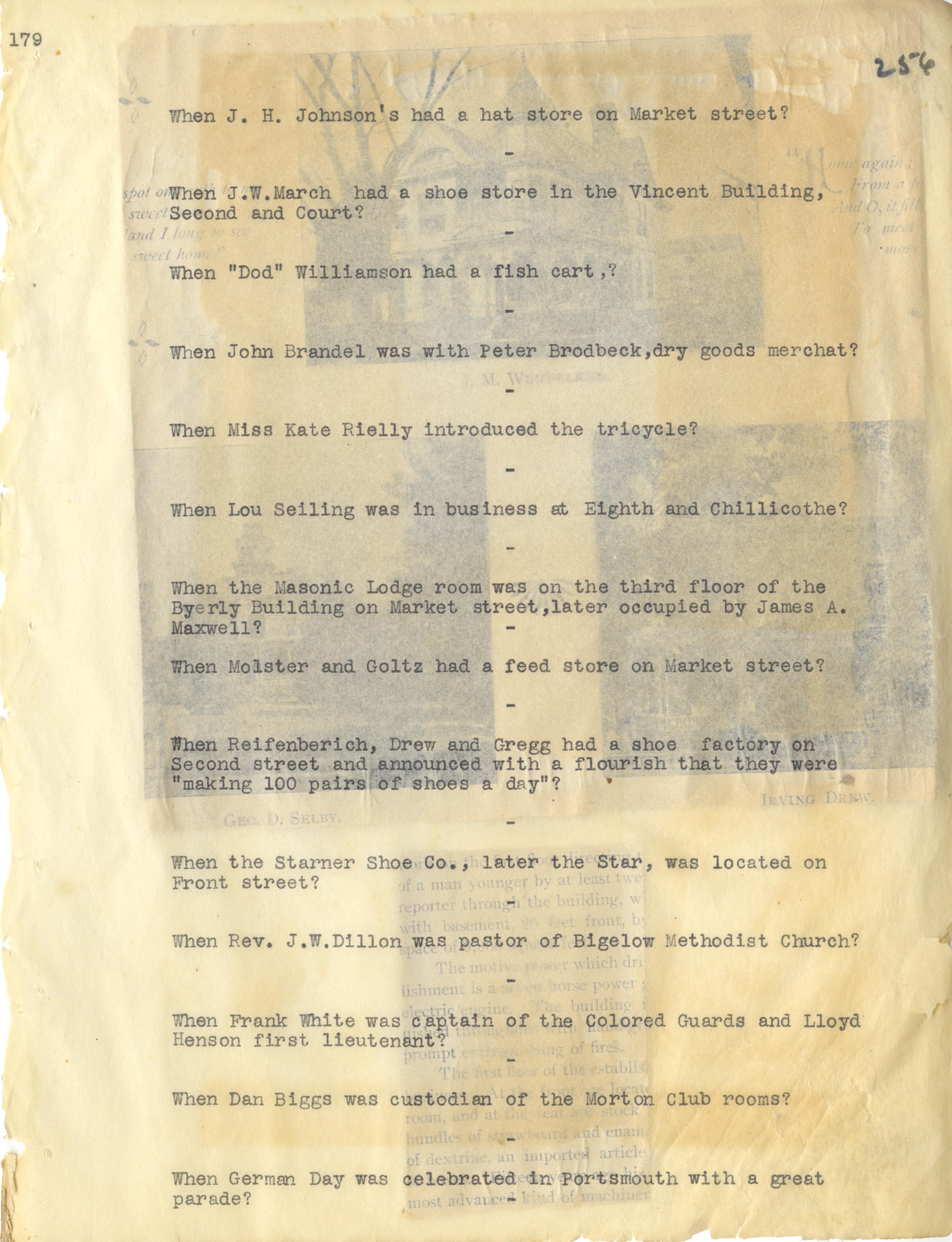 - Photo image of scanned scrapbook page. Pictured: typed page from Do You Remember Continued. J. H. Johnson's Hat Store; J. W. March; Vincent Building; "Dod" Williamson; John Brandel; Peter Brodbeck; Kate Rielly; Lou Selling; Masonic Lodge; Byerly Building; James A. Maxwell; Molster and Goltz; Reifenberich; Drew and Gregg Shoe Factory; Starner Shoe Co.; the Star Shoe Company; Starner Shoe Co.; Rev. J. W. Dillon; Bigelow Methodist Church; Frank White; Colored Guards; Lloyd Henson; Dan Biggs; Morton Club; German Day
