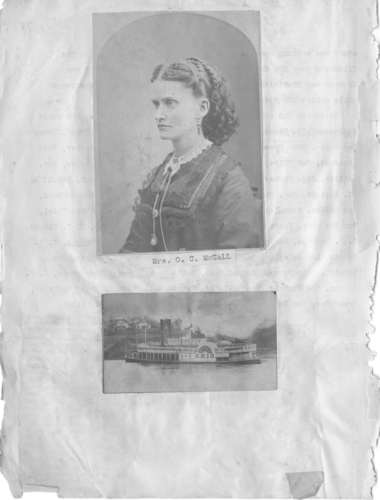 - Scanned unnumbered page from Henry A. Lorberg scrapbook containing black & white images of Mrs. O. C. McCall and the Ohio steamboat.