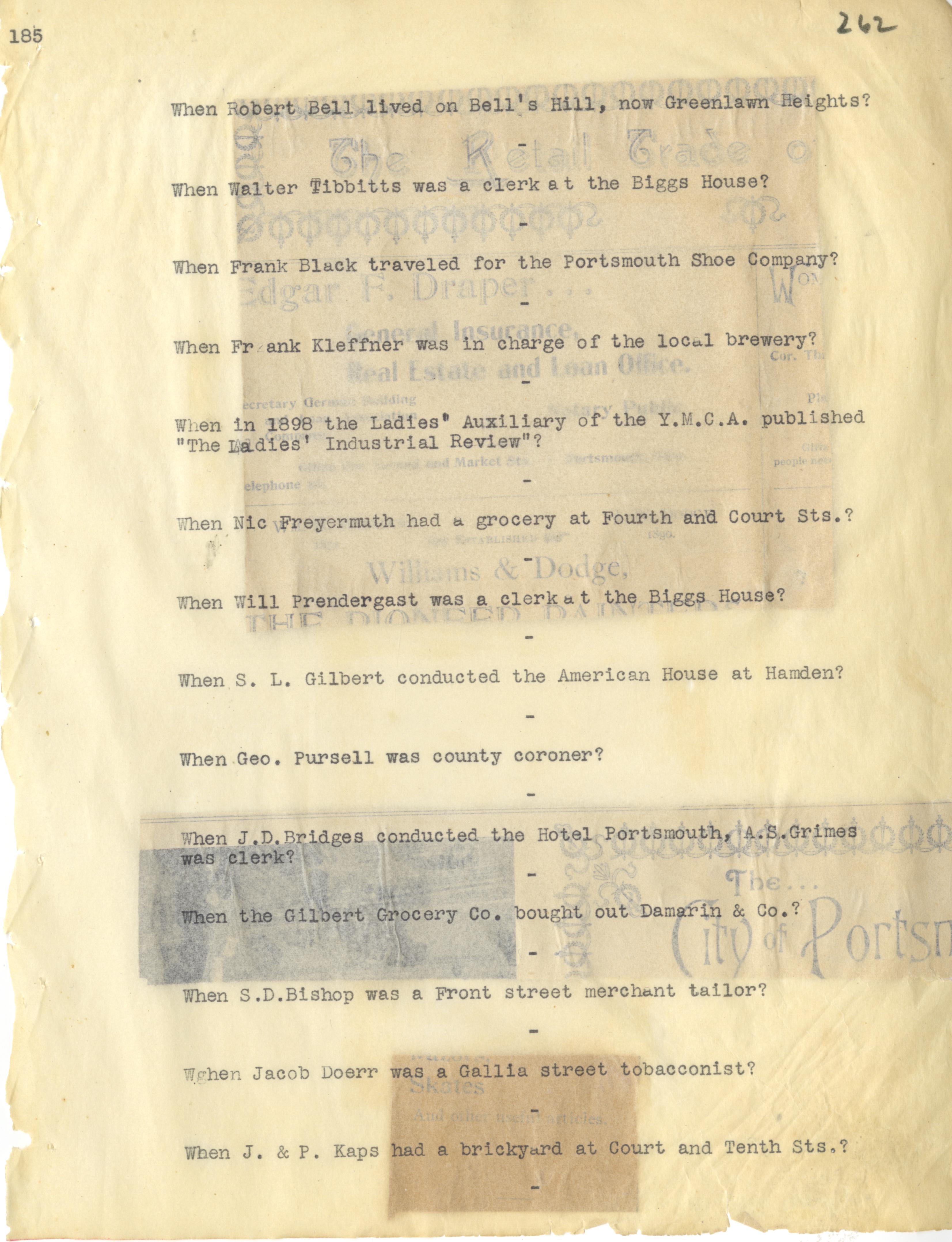- Photo image of scanned scrapbook page. Pictured: typed page from Do You Remember Continued. Robert Bell; Bell's Hill; Greenlawn Heights; Walter Tibbitts, clerk at the Biggs House; Frank Kleffner; Ladies' Auxiliary of the YMCA published "The Ladies' Industrial Review;" Nic Freyermuth; Will Prendergast; Biggs House; S. L. Gilbert; American House at Hamden; George Pursell; J. D. Briggs; Hotel Portsmouth; A. S. Grimes; Gilbert Grocery Company; Damarin & Company; S. D. Bishop; Jacob Doerrl J & P Kaps brickyard
