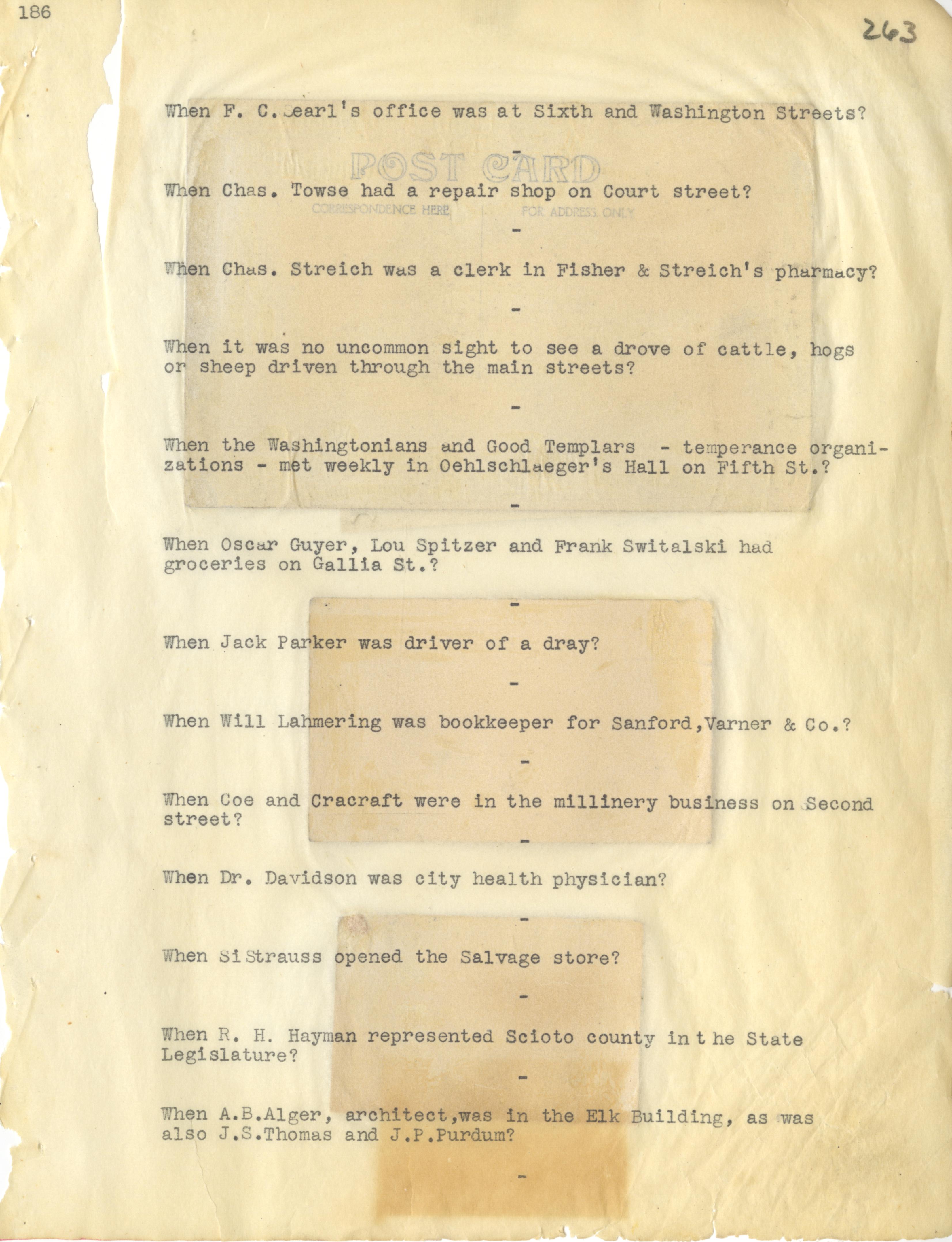 - Photo image of scanned scrapbook page. Pictured: typed page from Do You Remember Continued. F. C. Searl's office at Sixth (6th) and Washington Streets; Charles Towne; Charles Streich; Fisher & Streich's Pharmacy; Oehlschlaeger's Hall; Oscar Guyer; Lou Spitzer; Frank Switalski; Jack Parker; Will Lahmering; Sanford, Varner & Company; Coe and Cracraft; Dr. Davidson; Si Strauss' Salvage Store; R. H. Hayman represented Scioto county in the State Legislature; A. B. Alger; Elk Building; J. S. Thomas; J. P. Purdum