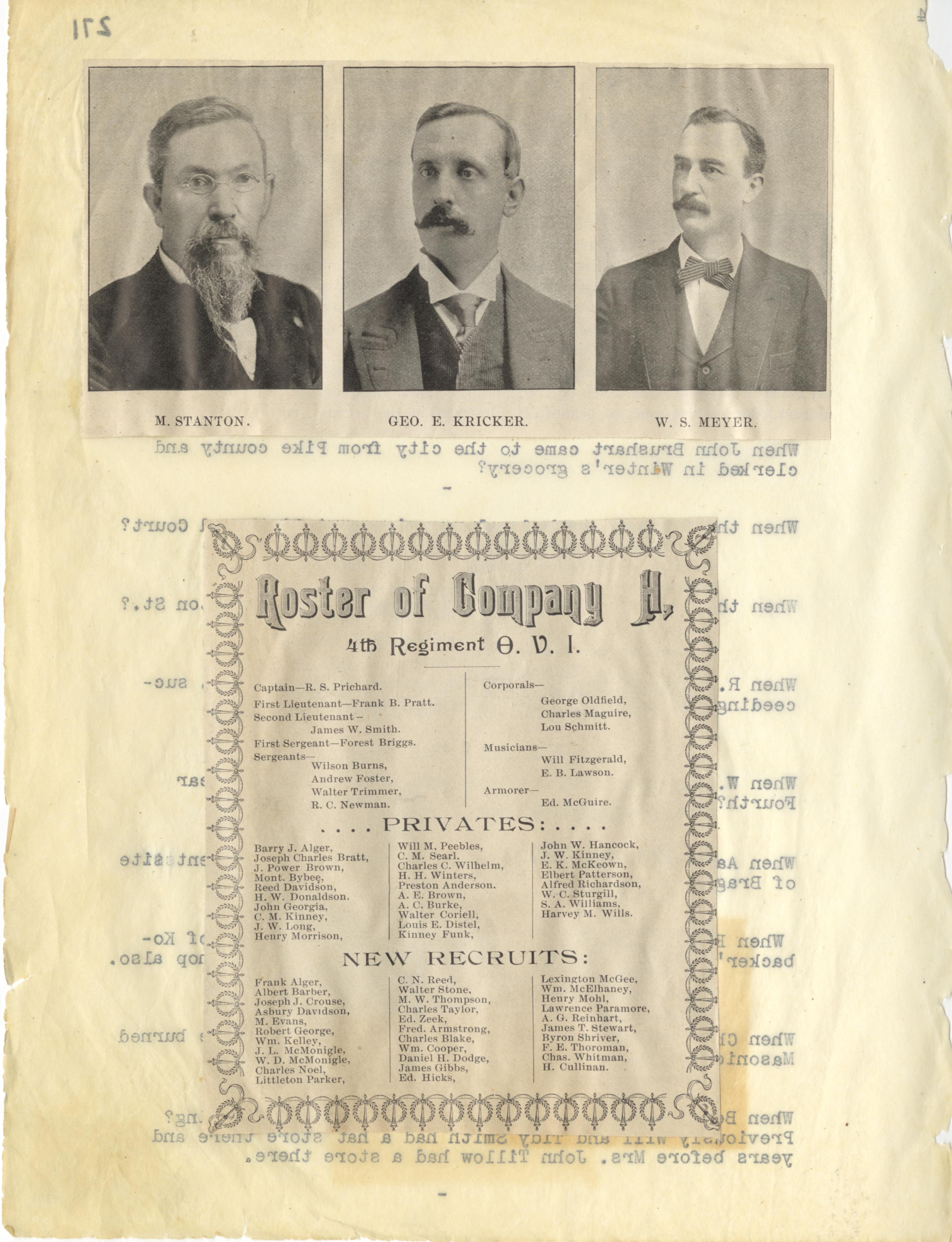 - Photo image of scanned scrapbook page. Pictured: M. Stanton; George E. Kricker; W. S. Meyer; Roster of Company H of the 4th Regiment of the Ohio Volunteer Infantry