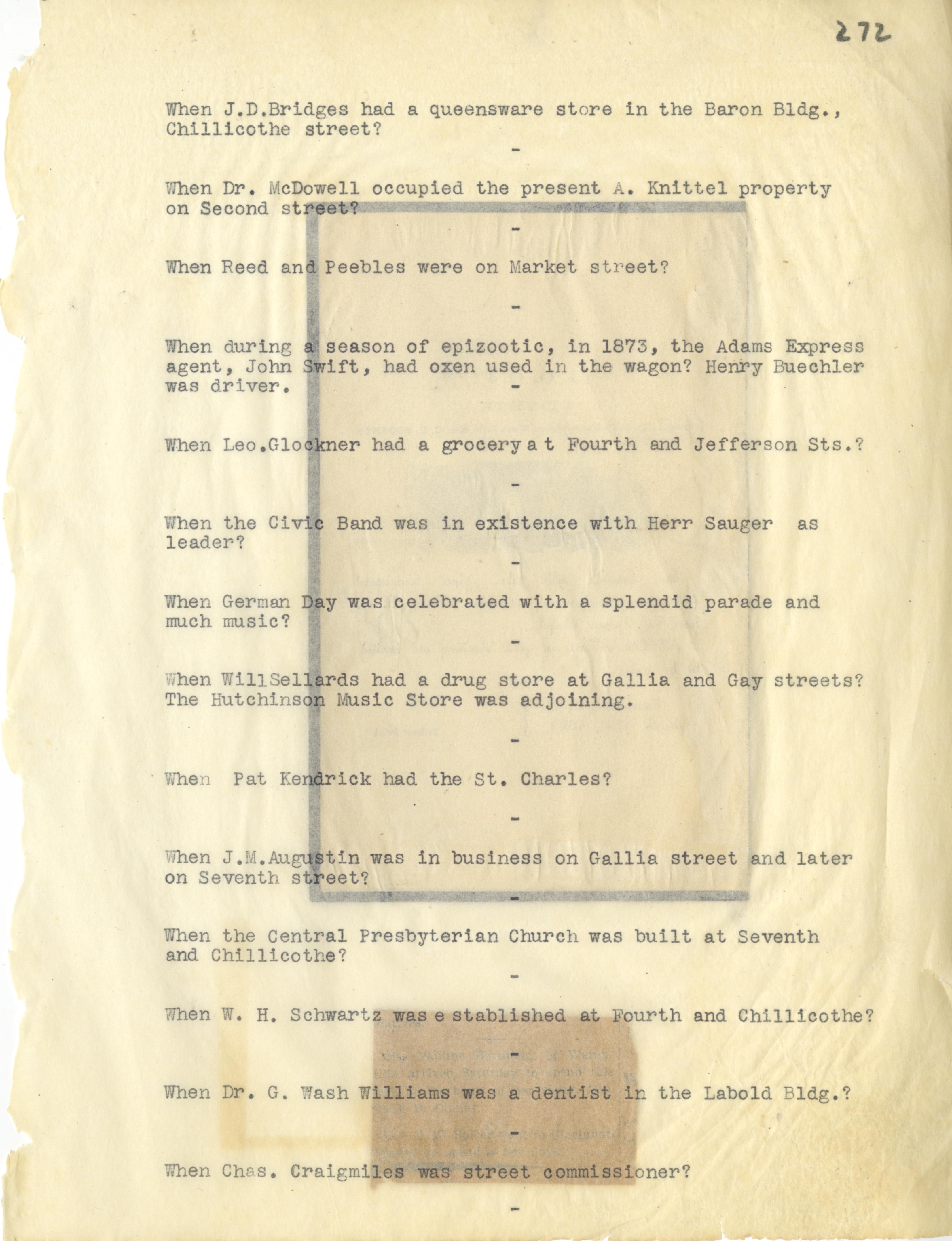 - Photo image of scanned scrapbook page. Pictured: typed page from Do You Remember Continued. J. D. Bridges; Baron Building; Dr. McDowell; A. Knittel; Reed and Peebles; Epizootic of 1873; Adams Express Agent, John Swift; Henry Buechler; Leonard Glockner; the Civic Band; Herr Sauger; German Day; Will Sellards; Hutchinson Music Store; Pat Kendrick; J. M. Augustin; Central Presbyterian Church; W. H. Schwartz; Dr. G. Wash Williams; Labold Building; Charles Craigmiles
