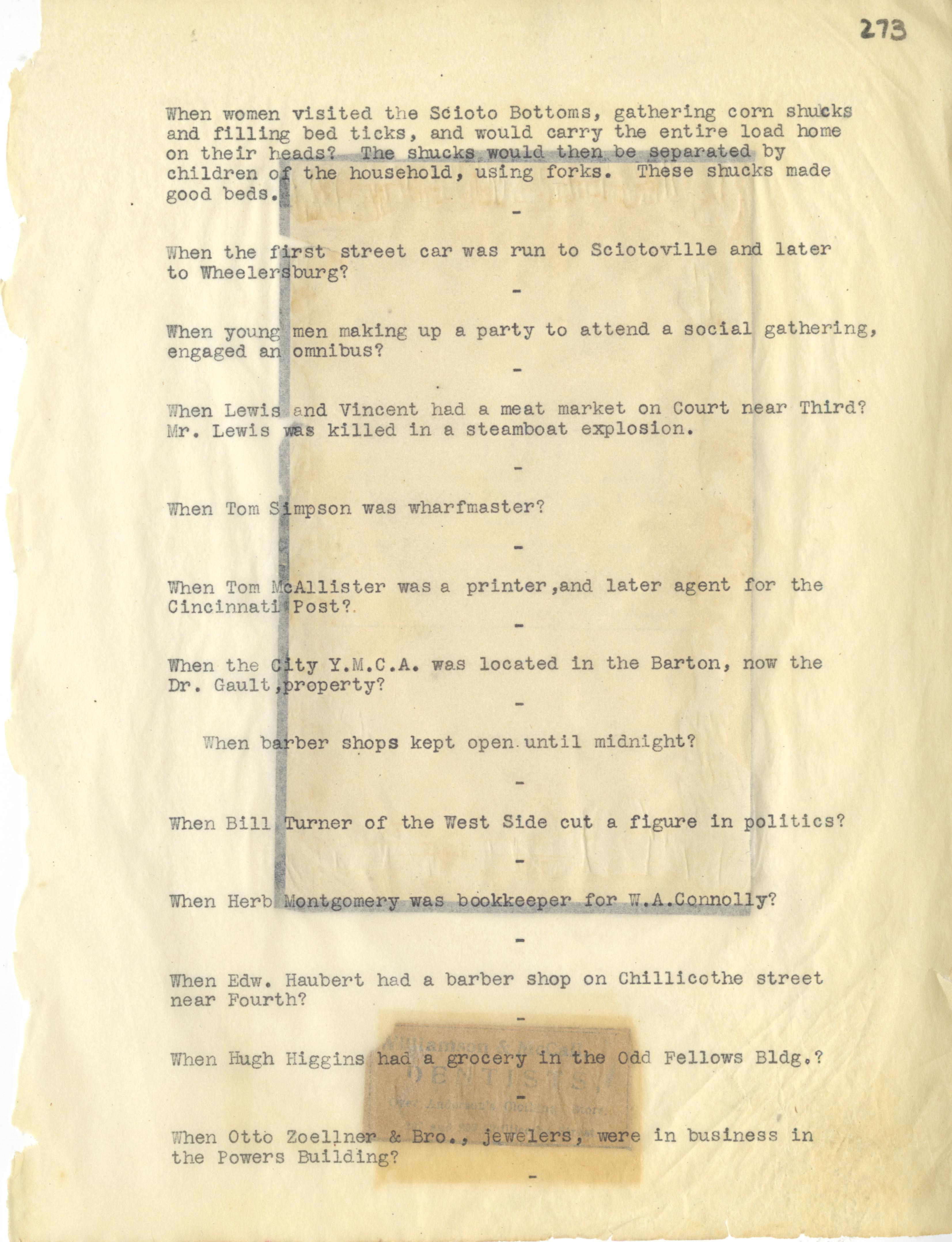 - Photo image of scanned scrapbook page. Pictured: typed page from Do You Remember Continued. Women visited the Scioto Bottoms to gather corn shucks; first street car to Sciotoville then Wheelersburg; Lewis and Vincent meat market; Tom Simpson, wharfmaster; Tom McAllister; City YMCA; Dr. Gault; Bill Turner; Herb Montgomery; W. A. Connolly; Edward Haubert; Hugh Higgins; Odd Fellows Building; Otto Zoellner & Brothers, jewelers in the Powers Building