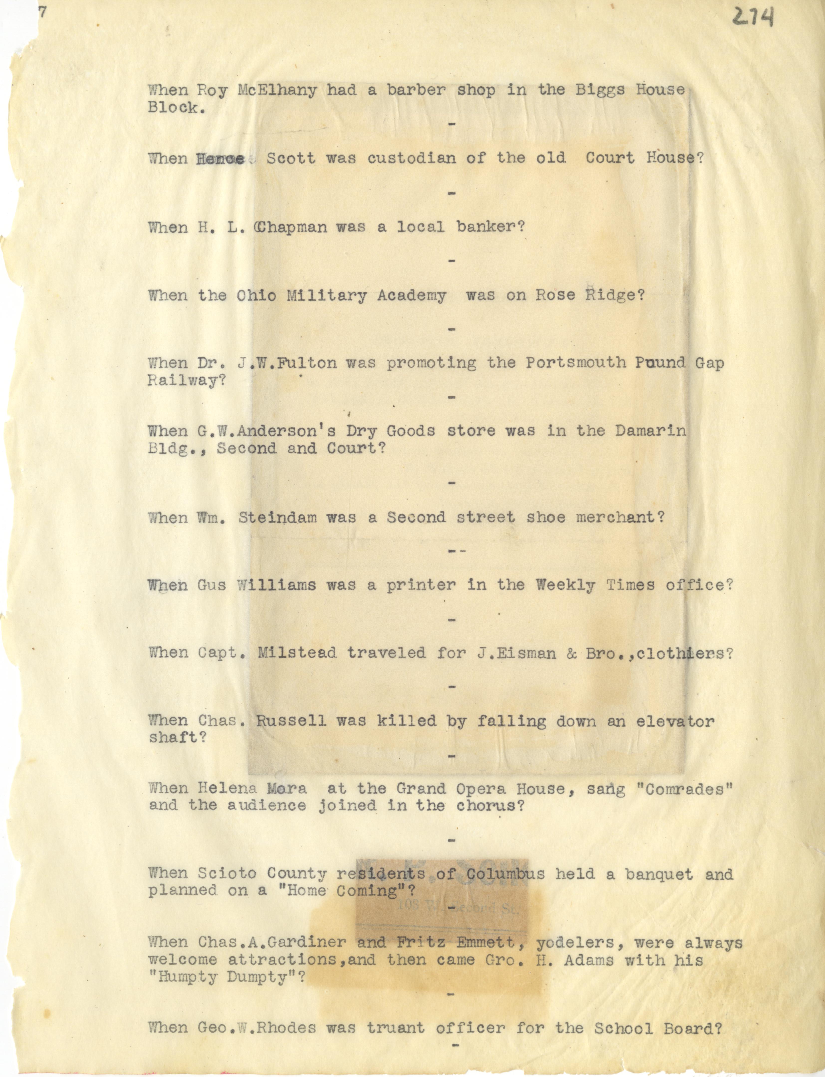 - Photo image of scanned scrapbook page. Pictured: type dpage from Do You Remember Continued. Roy McElhaney; Biggs House; Hence Scott; old Court House; H. L. Chapman; Ohio Military Academy on Rose Ridge; Dr. J. W. Fulton; Portsmouth Pound Gap Railway; G. W. Anderson's Dry Goods in the Damarin Building; William Steindam; Gus Williams; Weekly Times Office; Captain Milstead; J. Eisman & Brothers, clothiers; Charles Russell; Helena Mora; Grand Opera House; Scioto County Residence "Home Coming" banquet in Columbus; Charles A. Gardiner; Fritz Emmett; Gro. A. Adams; "Humpty Dumpty;" George W. Rhodes, truant officer for the School Board