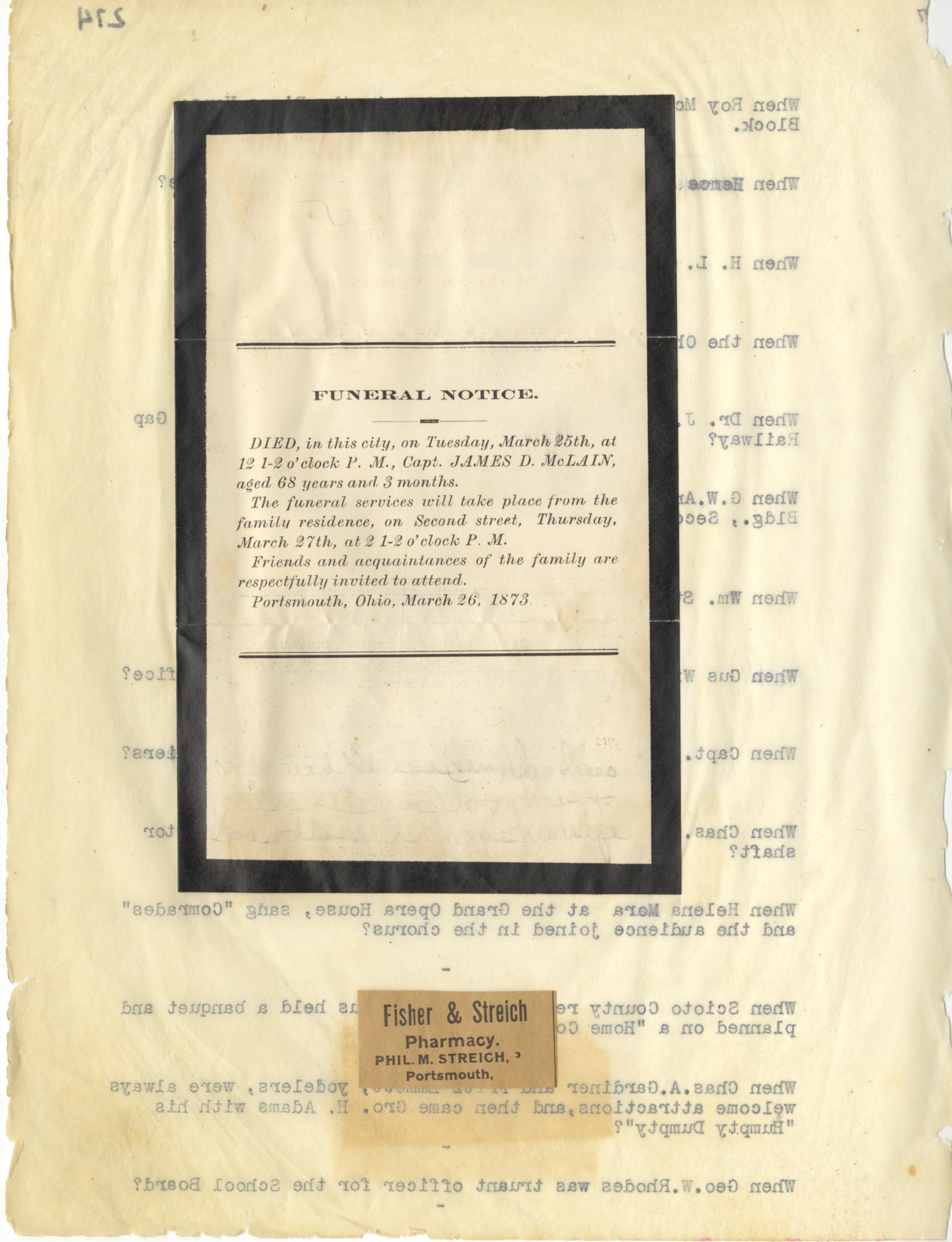- Photo image of scanned scrapbook page. Pictured: Funeral Notice for Captain James D. McClain who died March 25, 1873. Funeral was held March 27, 1873 at the family home on Second (2nd) Street; Ad for Fisher & Streich Pharmacy, Portsmouth