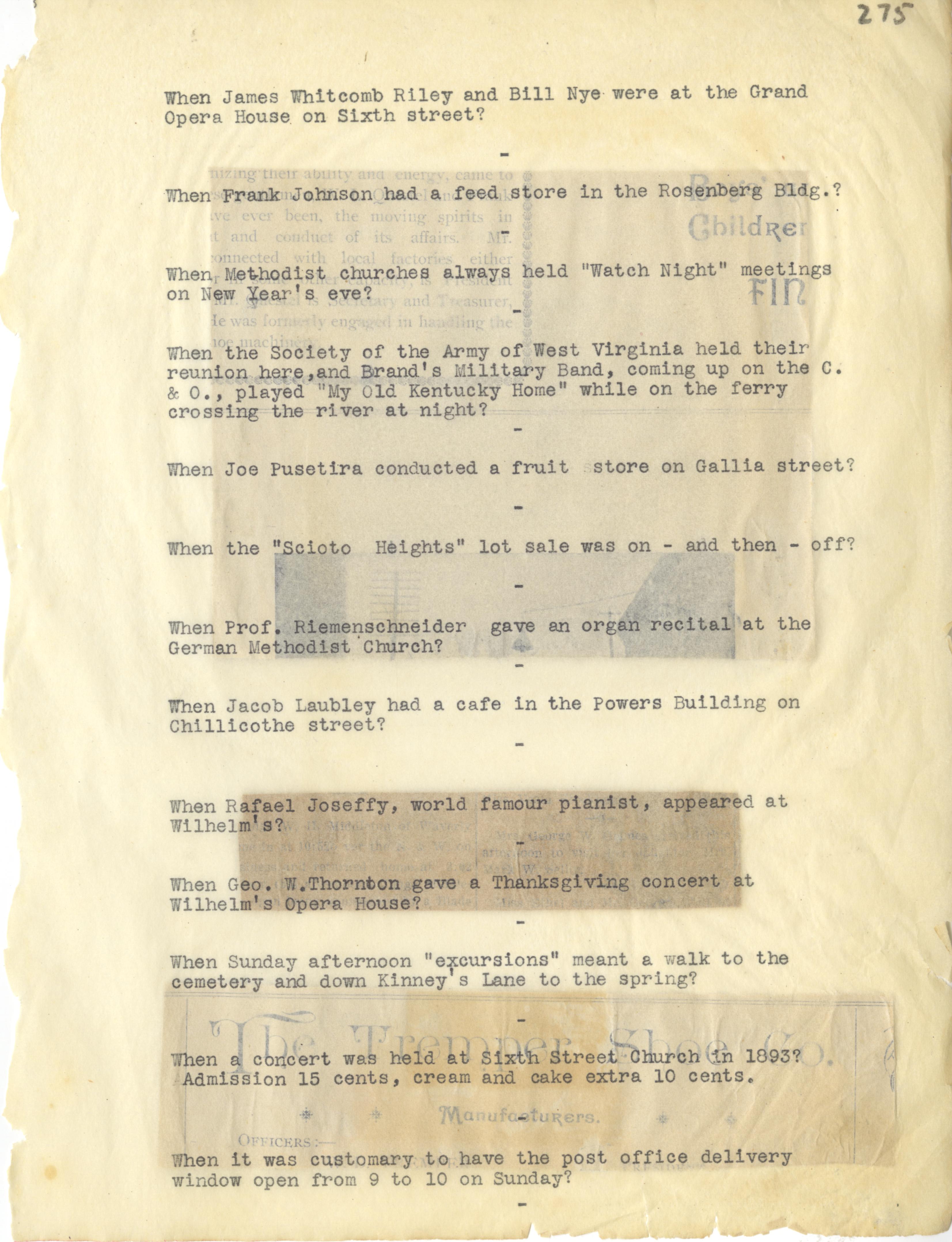 - Photo image of scanned scrapbook page. Pictured: typed page from Do You Remember Continued. James Whitcomb Riley; Bill Nye; Grand Opera House; Frank Johnson; Rosenberg Building; Methodist Churches; Watch Nigh meetings on New Year's Eve; Society of the Army of West Virginia; Brand's Military Band; C & O; Joe Pusetira; "Scioto Height;" Professor Riemenschneider; German Methodist Church; Jacob Laubley; Powers Building; Rafael Joseffy; Wilhelm's; George N. Thornton; Thanksgiving Concert at Wilhelm's Opera House; Kinney's Lane; concerts at Sixth (6th) Street Church; post office delivery in Sunday