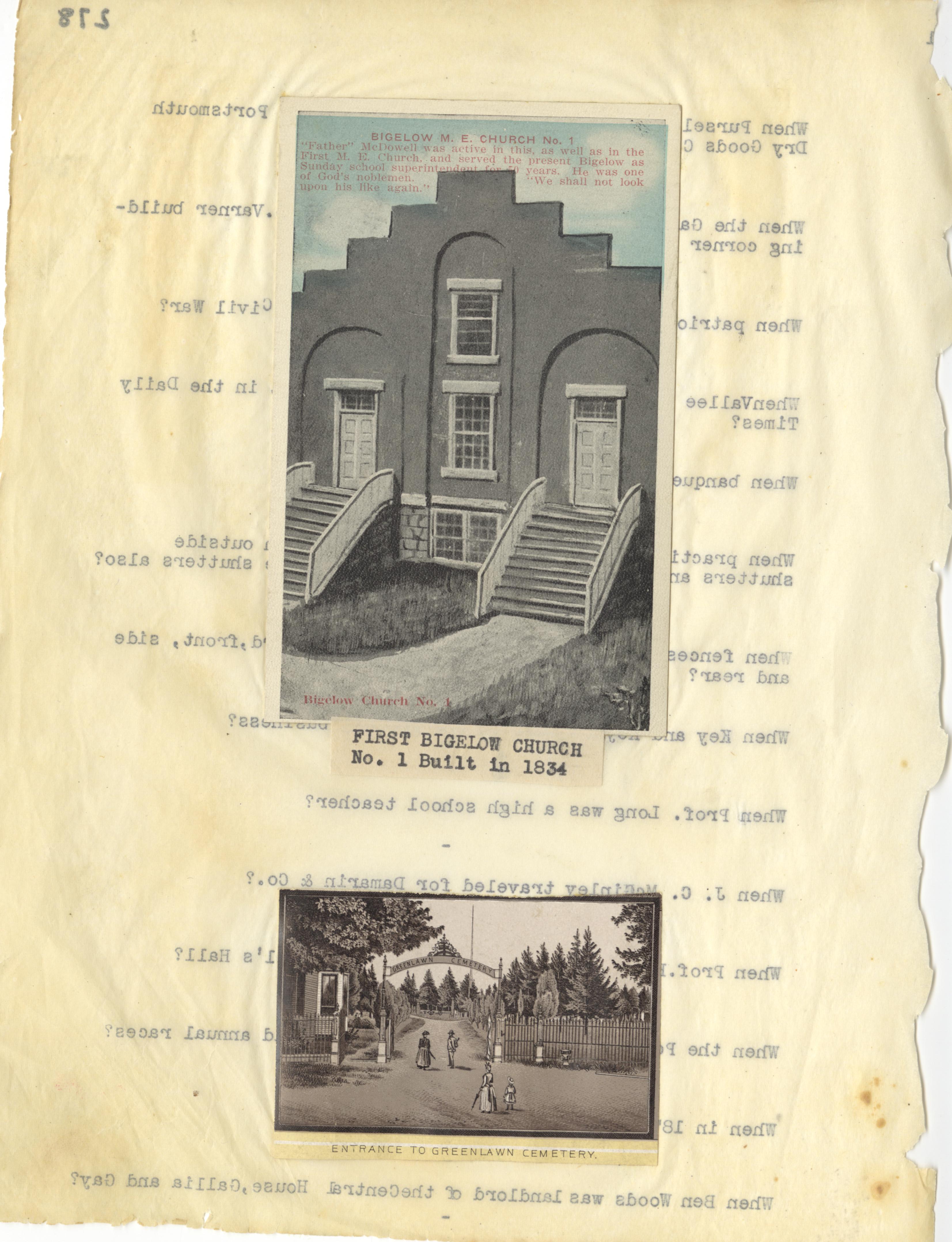- Photo image of scanned scrapbook page. Pictured: First Bigelow Church, No. 1 built in 1834; Entrance to Greenlawn Cemetery
