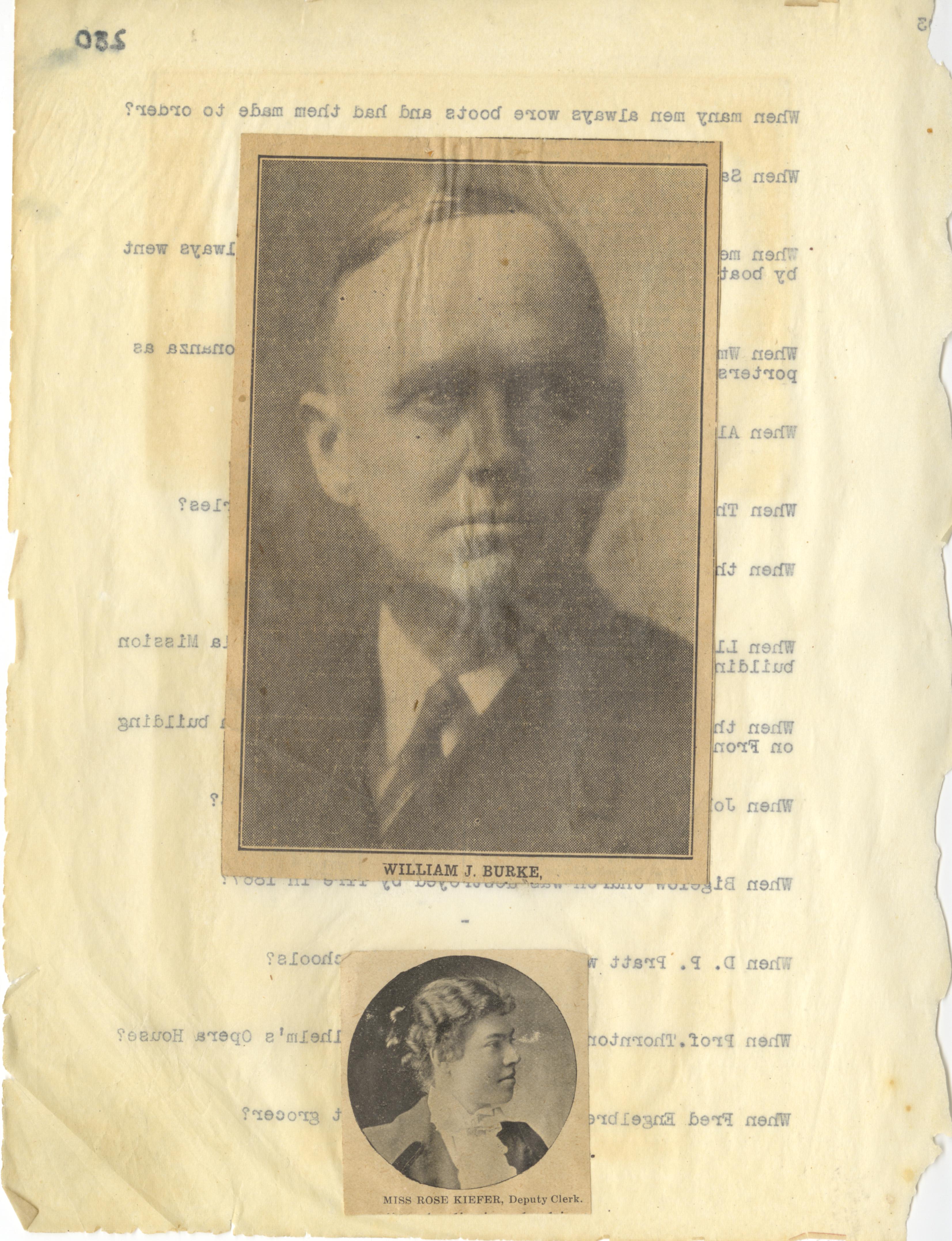 - Photo image of scanned scrapbook page. Pictured: two black and white photos of William J. Burke and Miss Rose Kiefer, Deputy Clerk