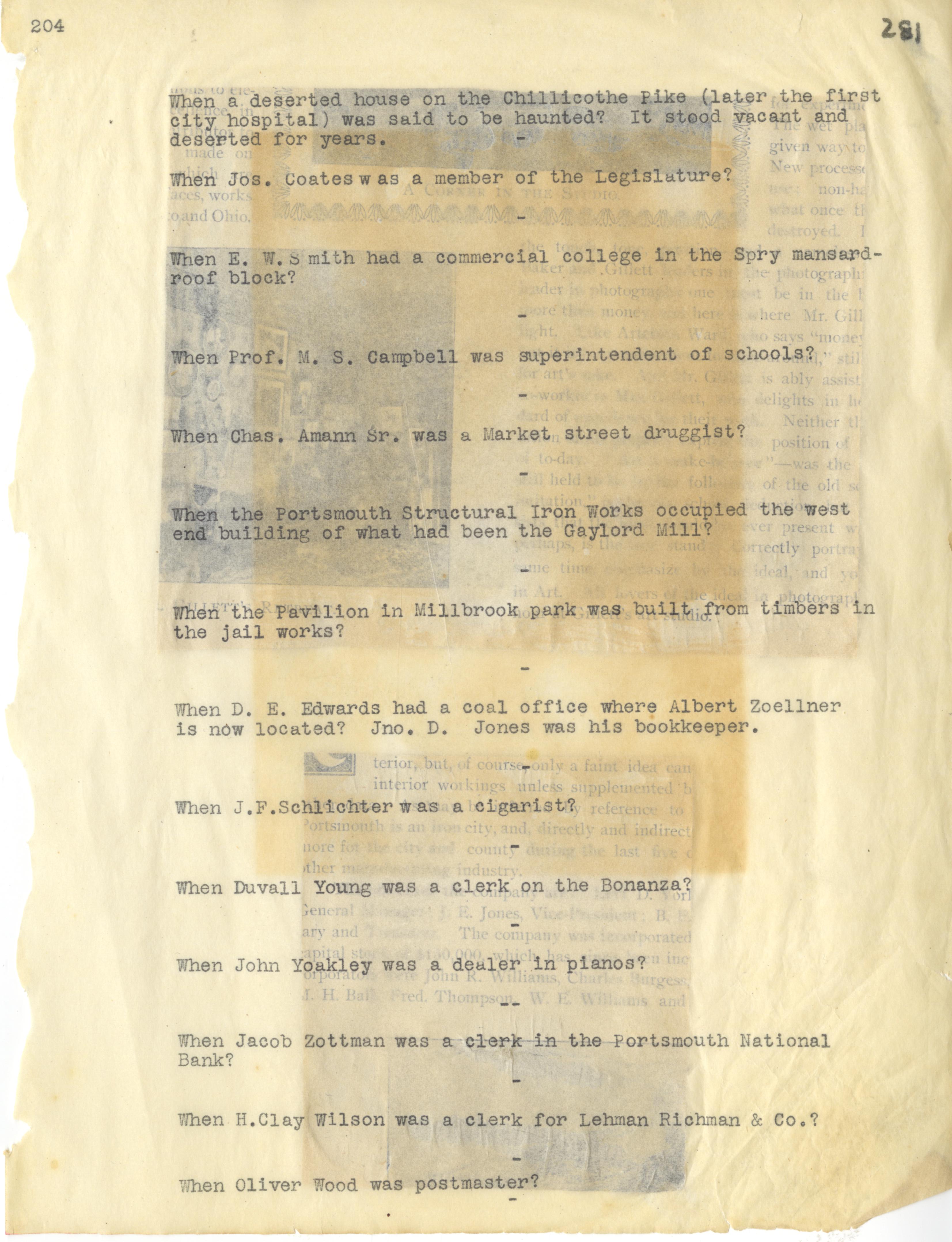 - Photo image of scanned scrapbook page. Pictured: typed page from Do You Remember Continued. Haunted house on Chillicothe Pike; Joseph Coates, member of the Legislature; E. W. Smith; Spry Mansardroof Block; Professor M. S. Campbell; Charles Amann Sr.; Portsmouth Structural Iron Works in the west end building of what was the Gaylord Mill; Pavillion in Millbrook Park; D. E. Edwards; Albert Zoellner; John D. Jones; J. F. Schlichter, cigarist; Duvall Young, clerk on the Bonanza; John Yoakley; Jacob Zottman; Portsmouth National Bank; H. Clay Wilson, clerk for Lehman Richman & Company; Oliver Wood, postmaster