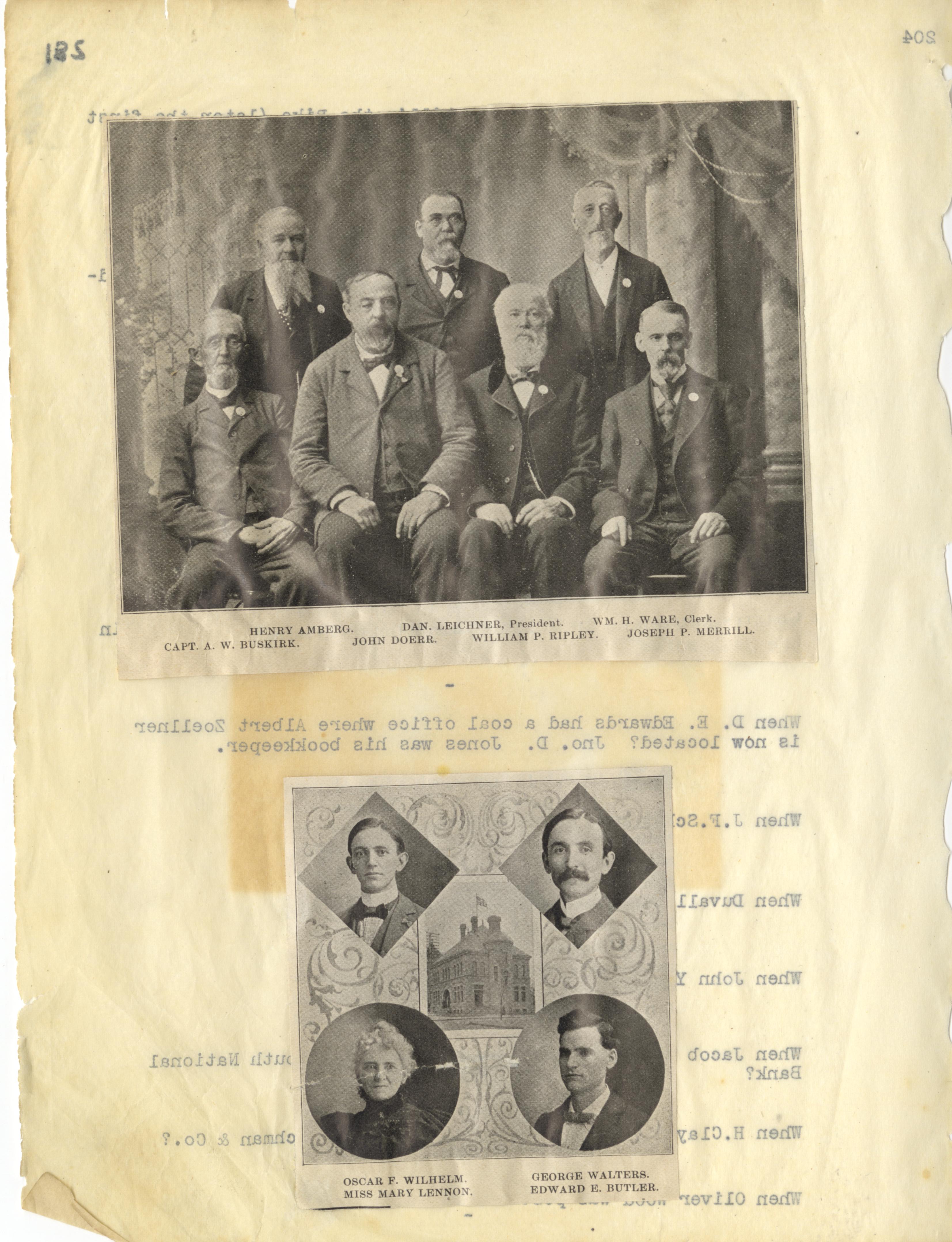 - Photo image of scanned scrapbook page. Pictured: two group photos of prominent Portsmouth citizens with names listed below. Pictured 1 is from an unknown company: Henry Amberg; Captain A. W. Buskirk; Dan Leichner, president; John Doerr; William P. Ripley; Joseph P. Merrill. Picture 2 is workers from the Government Building: Oscar F. Wilhelm; Mary Lennon; George Walters; Edward E. Butler