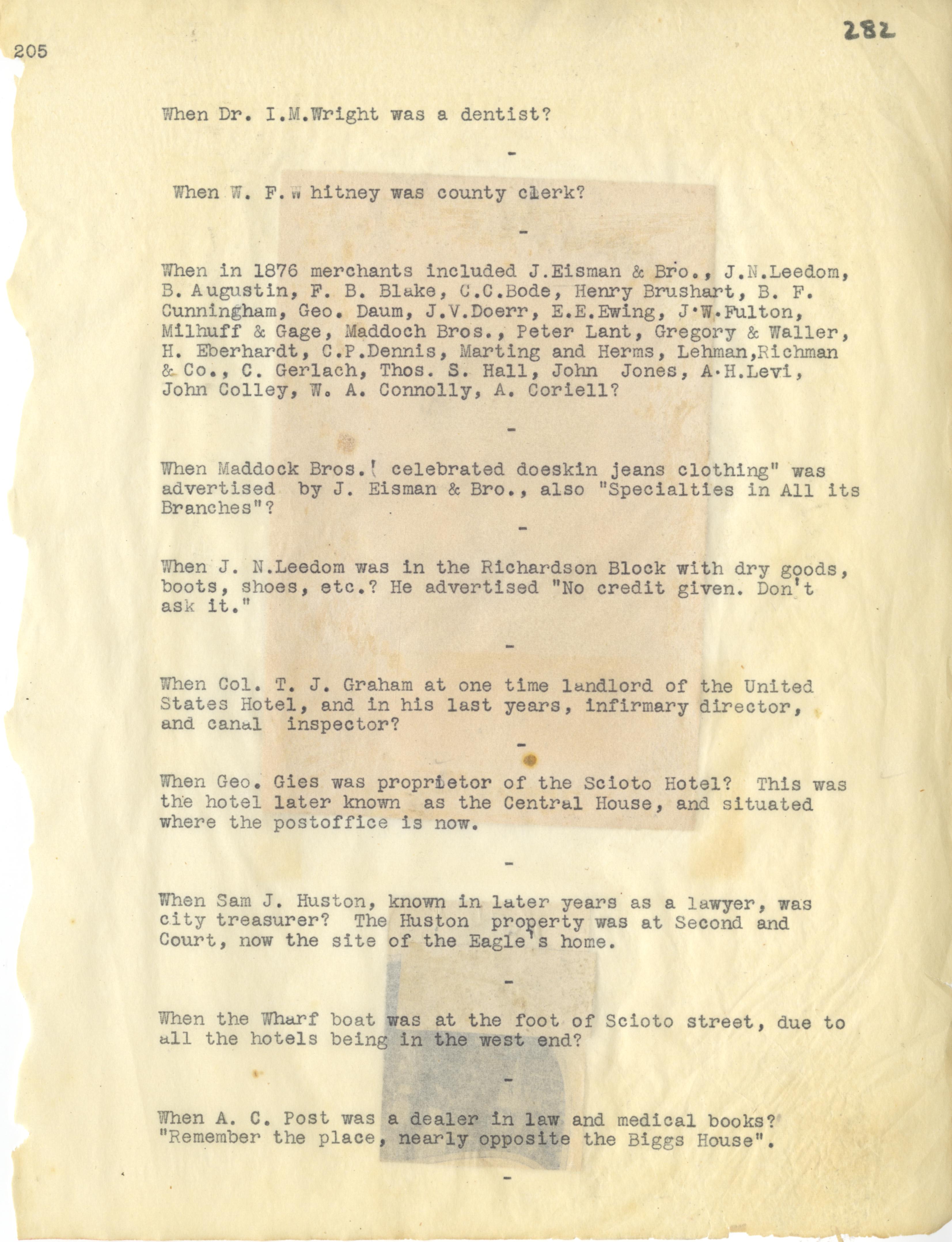 - Photo image of scanned scrapbook page. Pictured: typed page from Do You Remember Continued. Dr. I. M. Wright; W. F. Whitney; J. Eisman & Bro.; J. N. Leedom; B. Augustin; F. B. Blake; C. C. Bode; Henry Brushart; B. F. Cunningham; George Daum; J. V. Doerr; E. E. Ewing; J. W. Fulton; Milhuff & Gagel Maddoch Brothers; Peter Lant; Gregor & Waller; H. Eberhard; C. P. Dennis; Marting and Herms; Lehman, Richman & Company; C. Gerlach; Thomas S. Hall; John Jones; A. H. Levi; John Colley; W. A. Connolly; A. Coriell; Maddock Brothers; J. Eisman & Bro.; J. N. Leedom; Richardson Block; Col. T. J. Graham; United States Hotel; George Gies; Scioto Hotel; Central House; Sam J. Huston; Eagle's Home; Wharf boat; A. C. Post; Biggs House