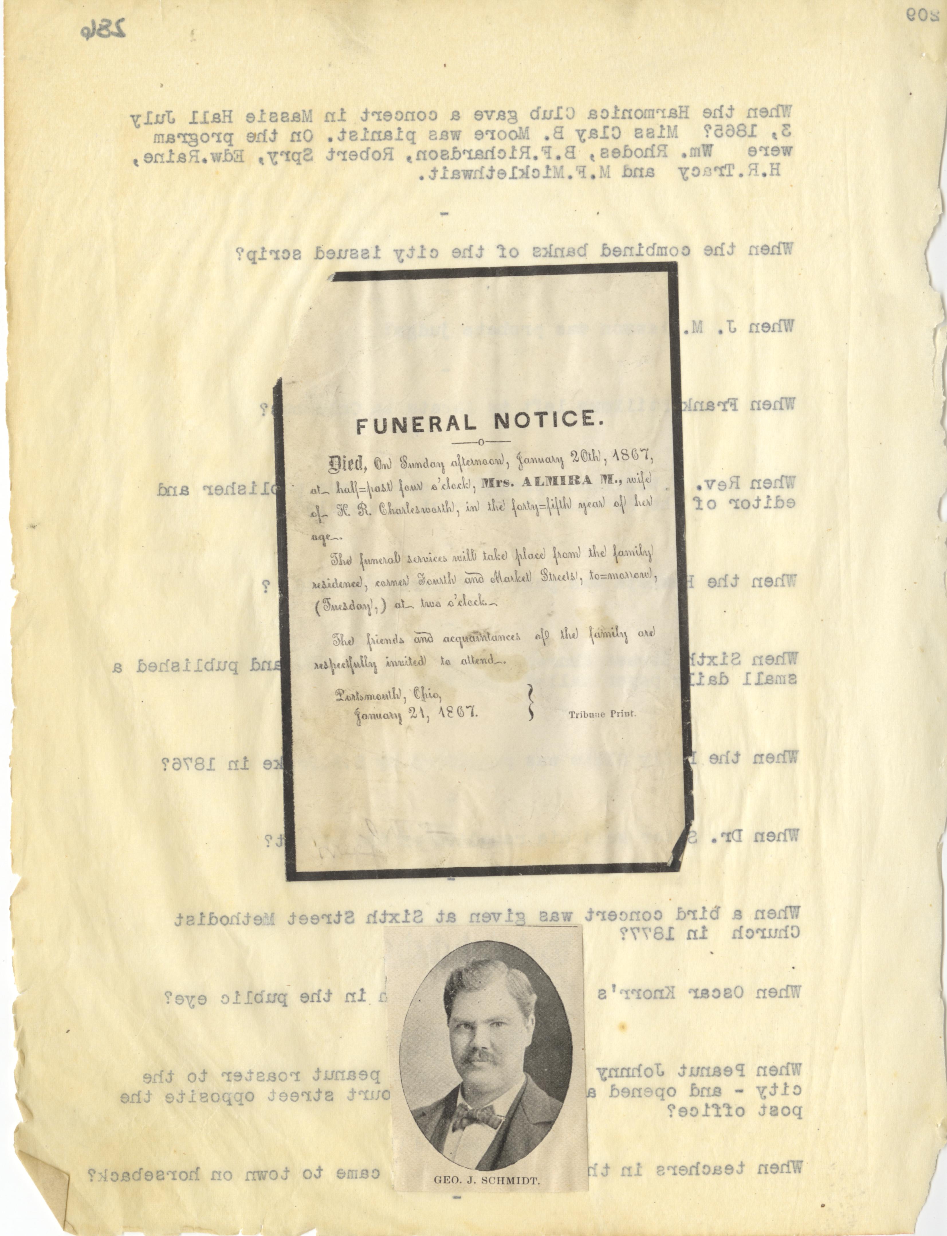 - Photo image of scanned scrapbook page. Pictured: George J. Schmidt; Funeral Notice of Almira M. Charlesworth, dated January 24, 1867