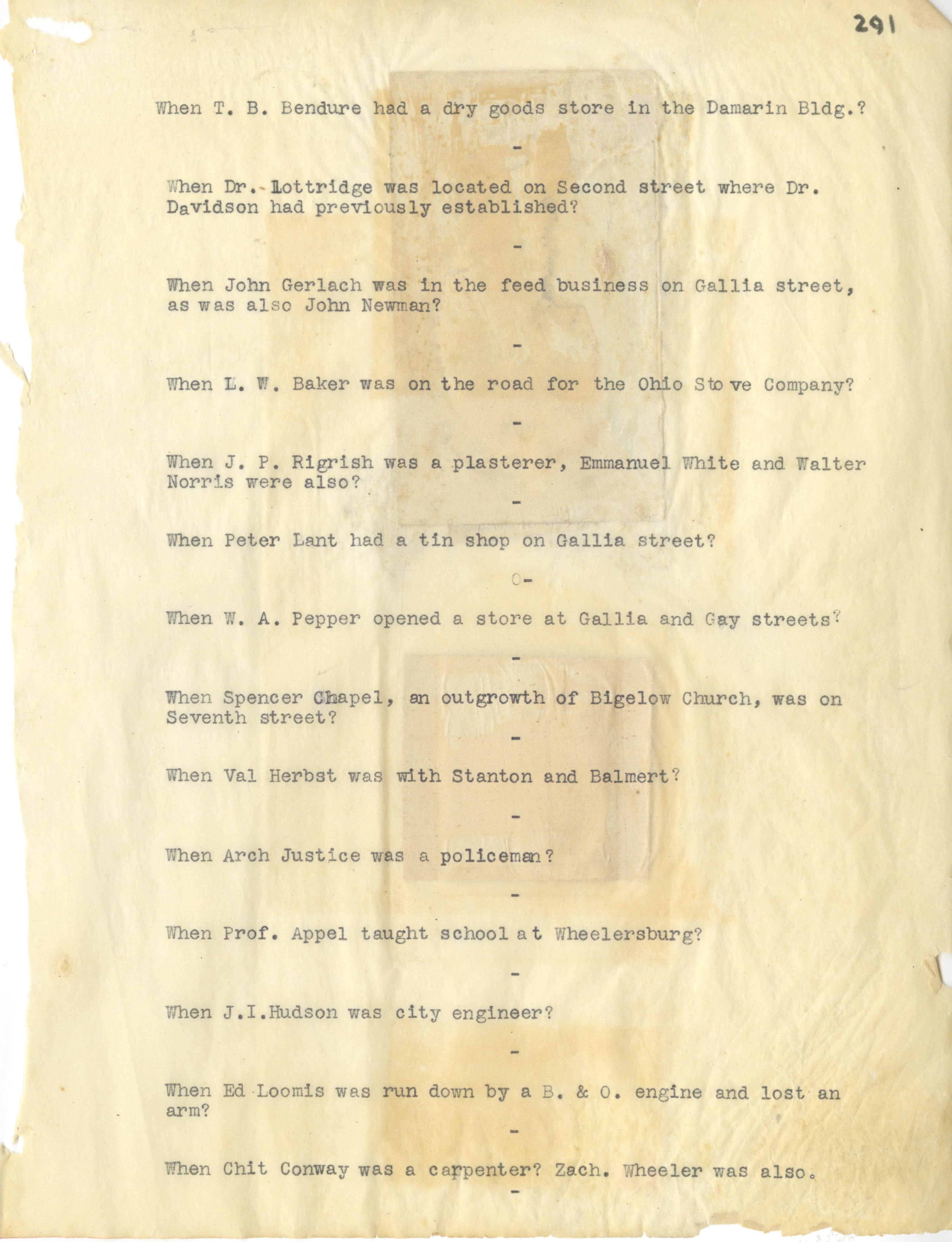 - Photo image of scanned scrapbook page 291. T.B. Bendure; Damarin Building; Dr. Lottridge; Dr. Davidson; John Gerlach; John Newman; L.W. Baker; Ohio Stove Company; J.P. Rigrish; Emmanuel White; Walter Norris; Peter Lant; W.A. Pepper; Spencer Chapel; Bigelow Church; Val Herbst; Stanton Balmert; Arch Justice; Professor Appel; J.I. Hudson; Ed Loomis; B. & O. Engine; Chit Conway; Zachary Wheeler