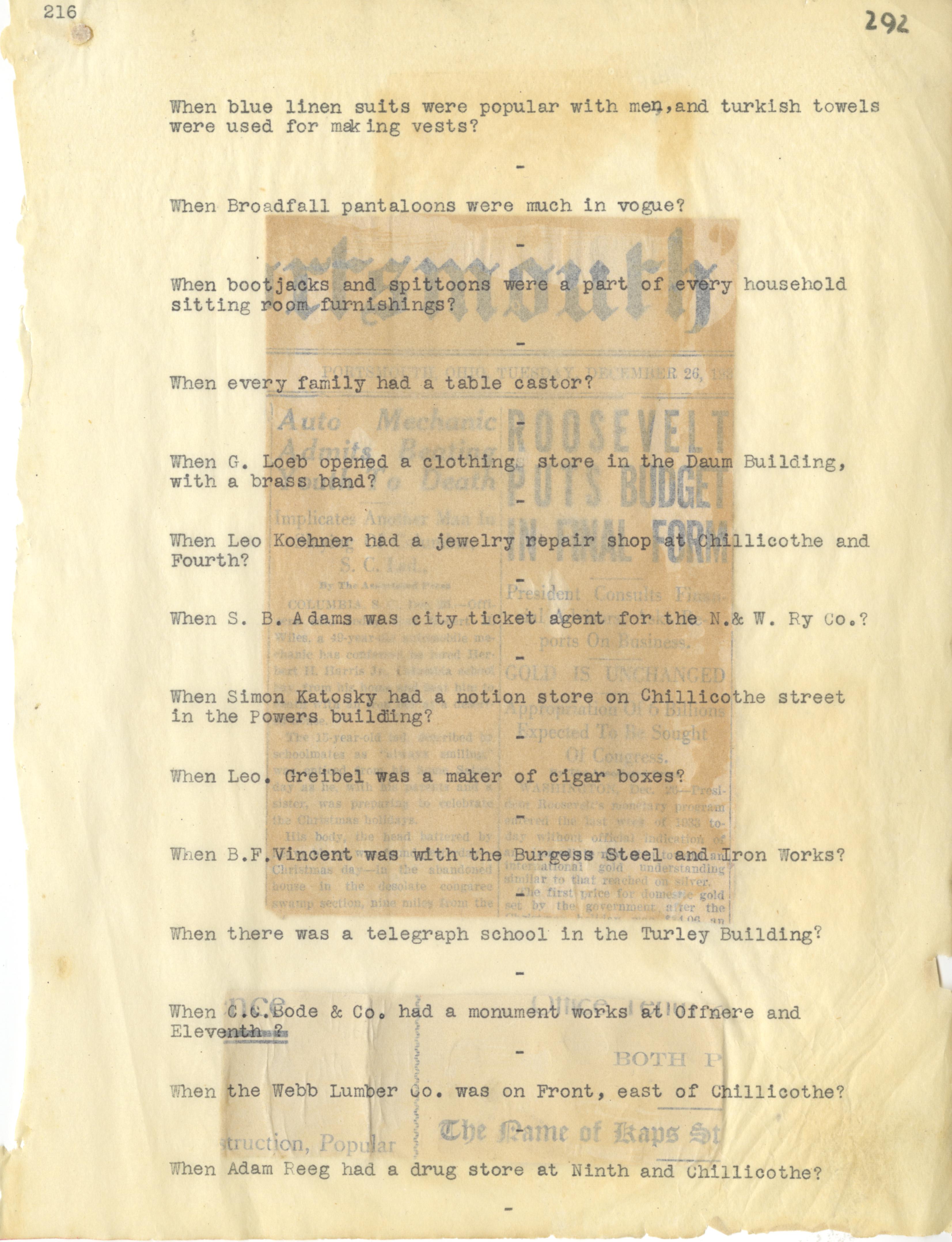 - Photo image of scanned scrapbook page 292. Pictured: Broadfall Pantaloons; G. Loeb; Daum Building; Leo Koehner; S.B. Adams; N. & W. Ry Co.; Simon Katosky; Powers Building; Leonard Greibel; B.F. Vincent; Burgess Steel and Iron Works; Turley Building; C.C. Bode & Co; Webb Lumber Co; Adam Reeg
