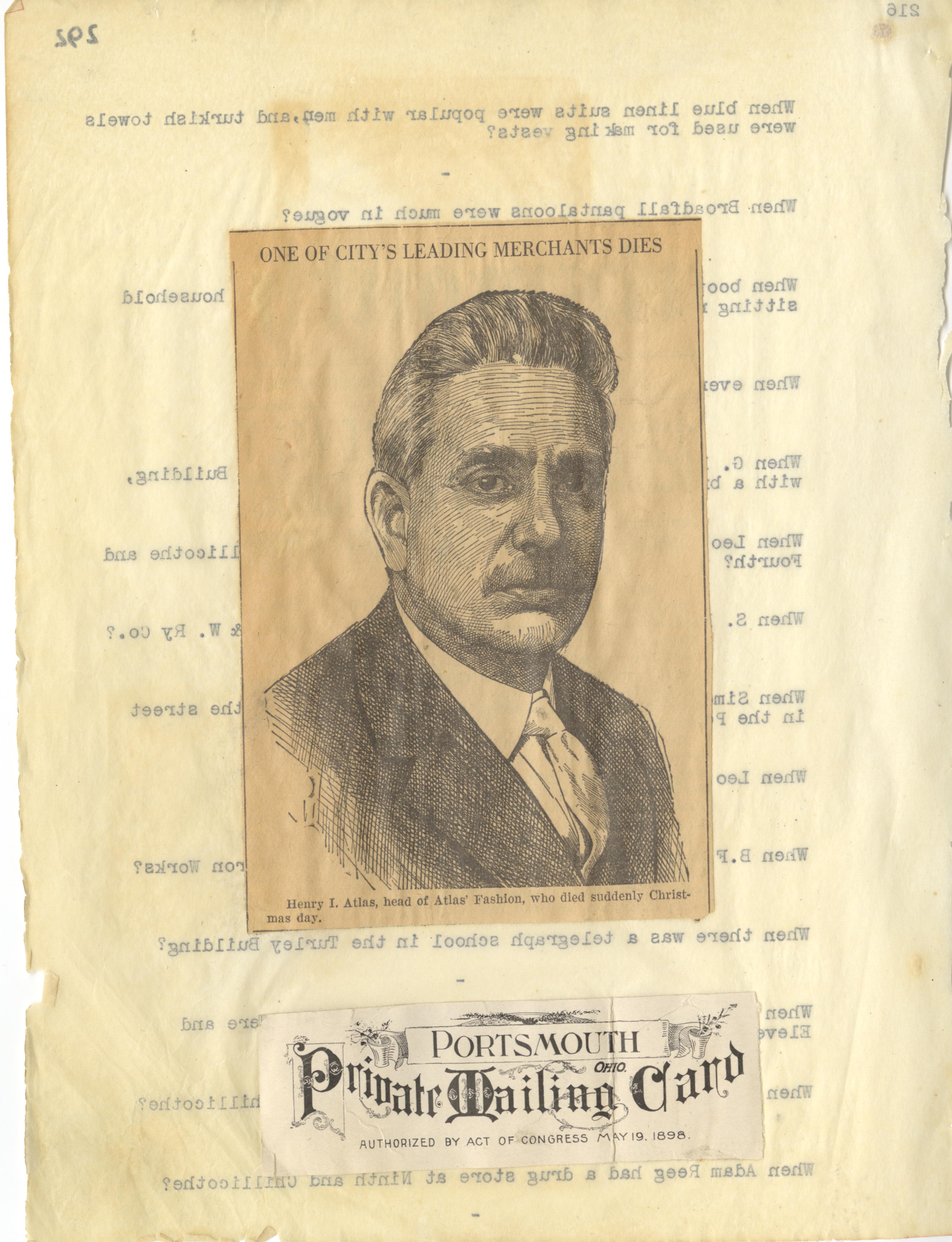 - Photo image of scanned scrapbook page. Pictured: One of City's Leading Merchants Dies; Henry I. Atlas; Portsmouth Private Mailing Card (1895)