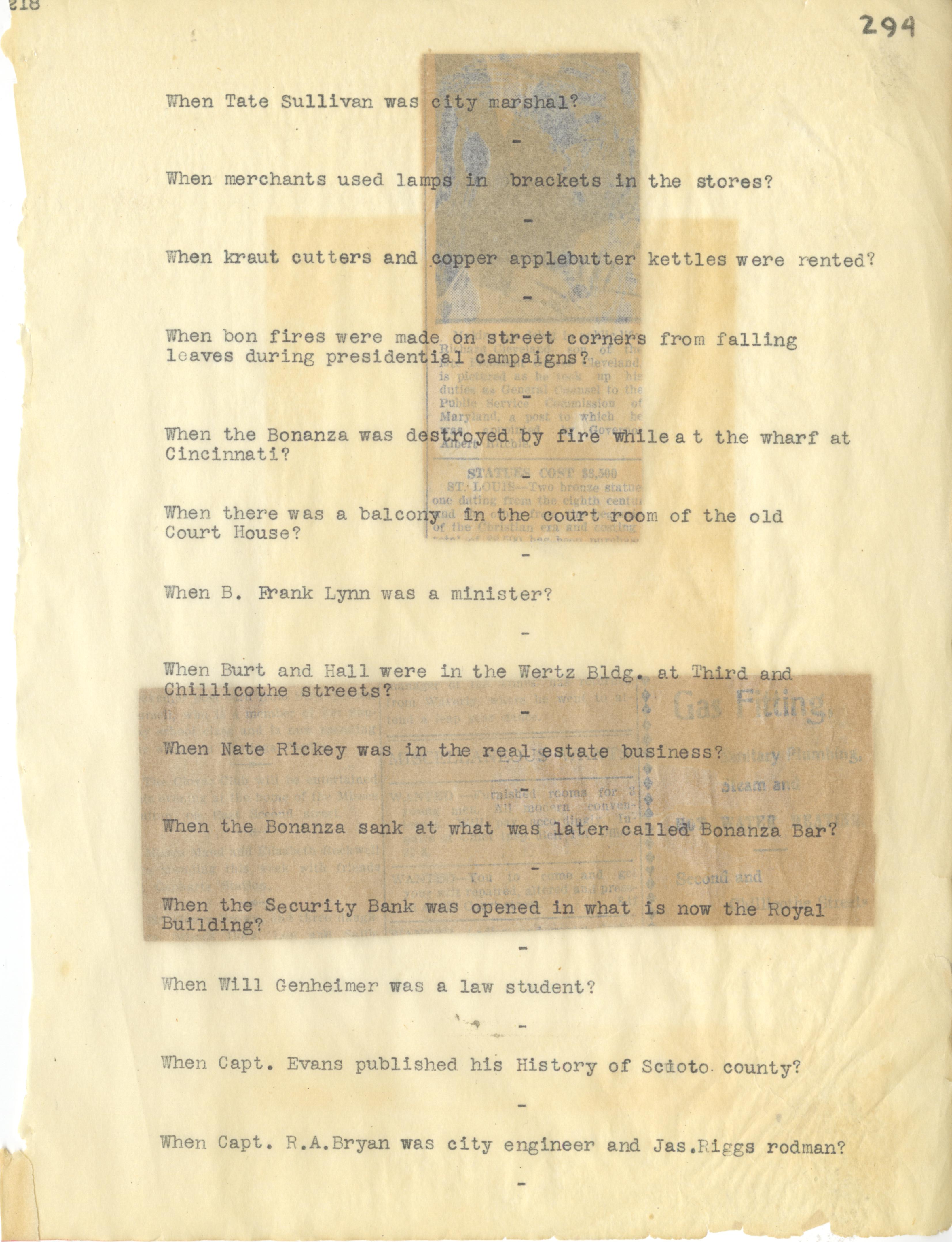 - Photo image of scanned scrapbook page 294. Pictured: Tate Sullivan; Bonanza; B. Frank Lynn; Wertz Building; Nate Rickey; Security Bank; Royal Building; Will Genheimer; Captain Evans; History of Scioto County; Captain R.A. Bryan; James Riggs