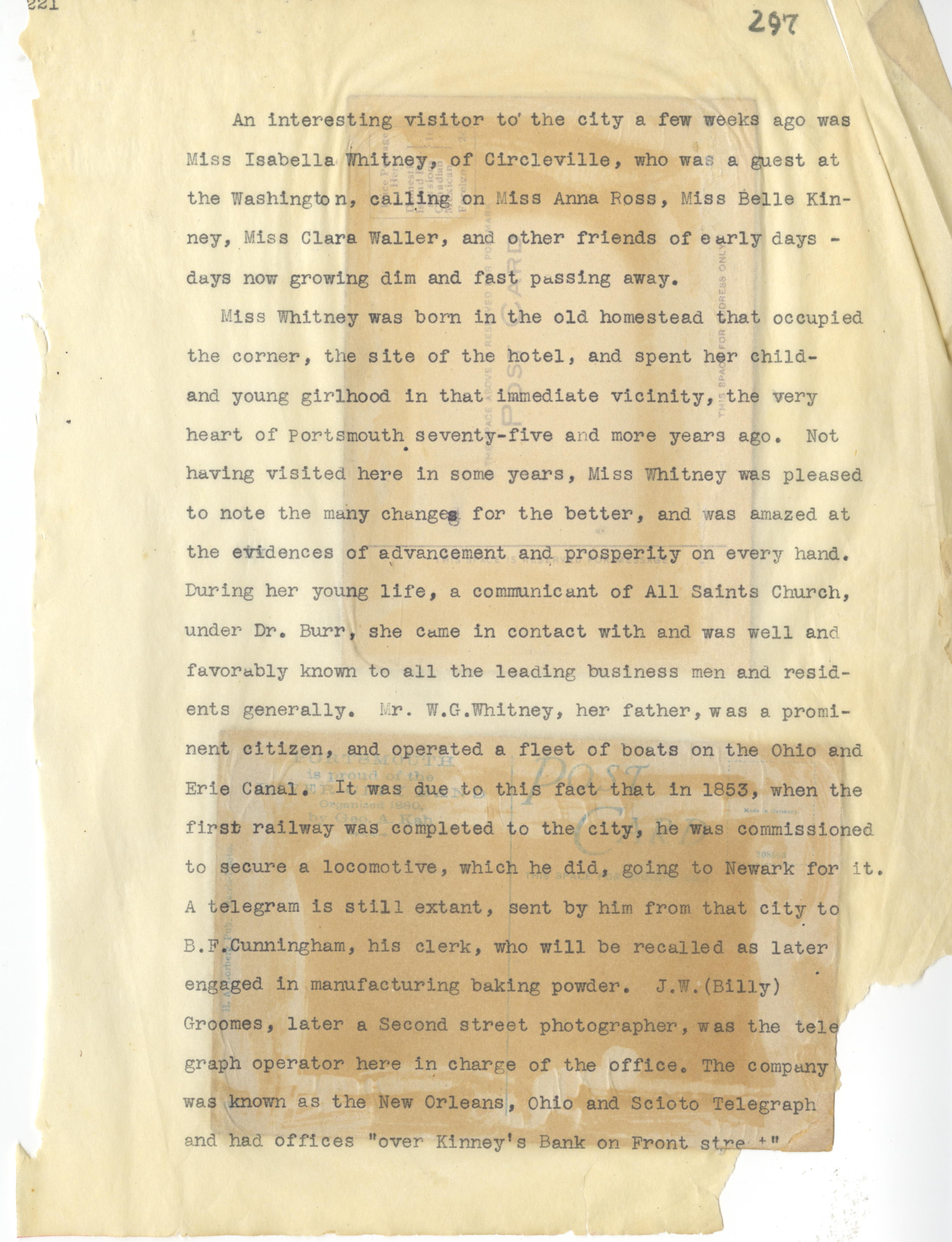 - Photo image of scanned scrapbook page 297. Pictured: Miss Isabella Whitney; Washington; Anna Rose; Belle Kinney; Clara Waller; All Saints Church; Dr. Burr; Mr. W.G. Whitney; Ohio and Erie Canal; Railway (1853); B.F. Cuningham; J.W. (Billy) Groomes; Ohio and Scioto Telegraph