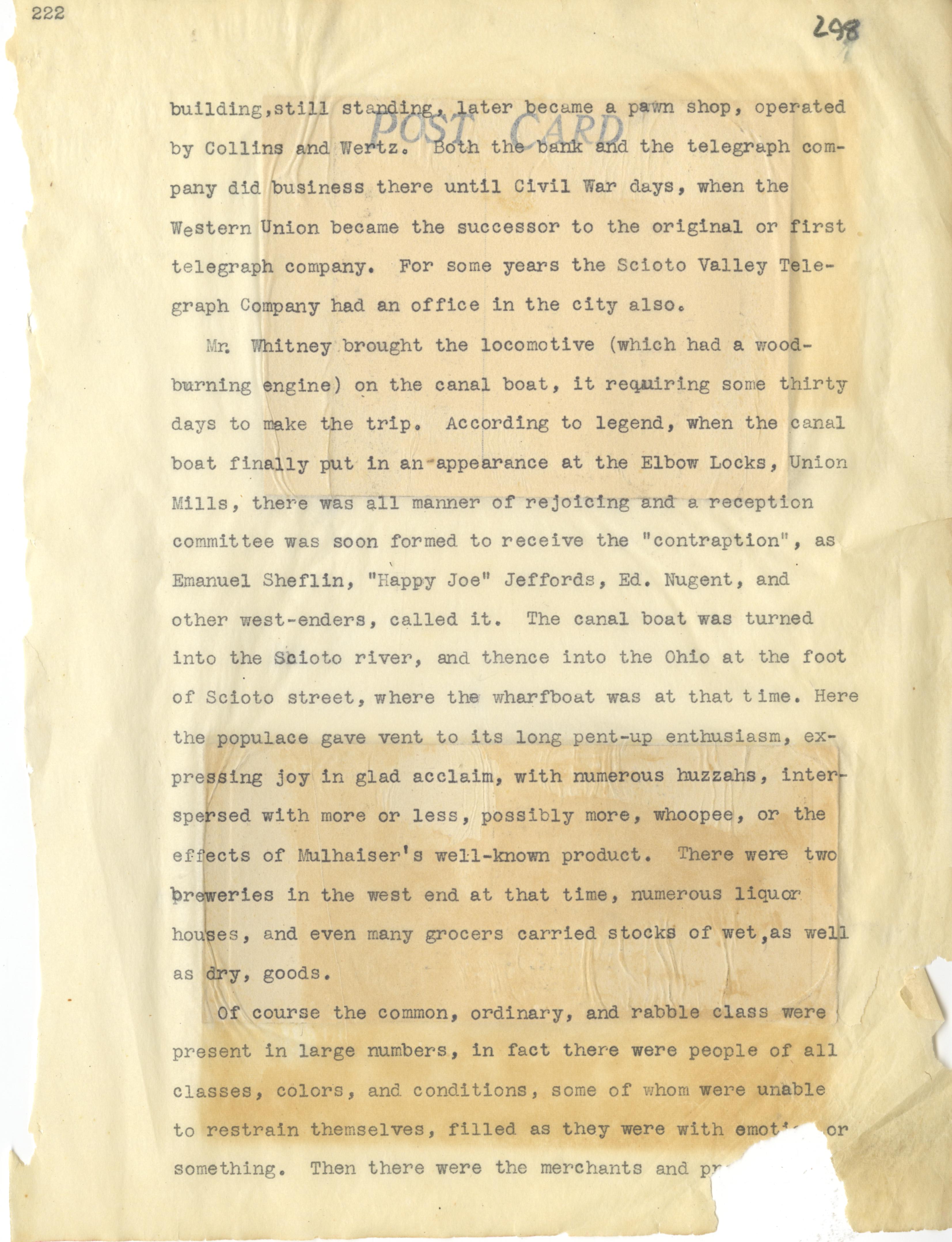 - Photo image of scanned scrapbook page 298. Pictured: Collins and Wertz; Civil War; Western Union; Scioto Valley Telegraph Company; Mr. Whitney; Locomotive; Elbow Locks; Union Mills; Emanuel Sheflin; "Happy Joe" Jeffords; Edward Nugent; Canal Boat; Scioto River