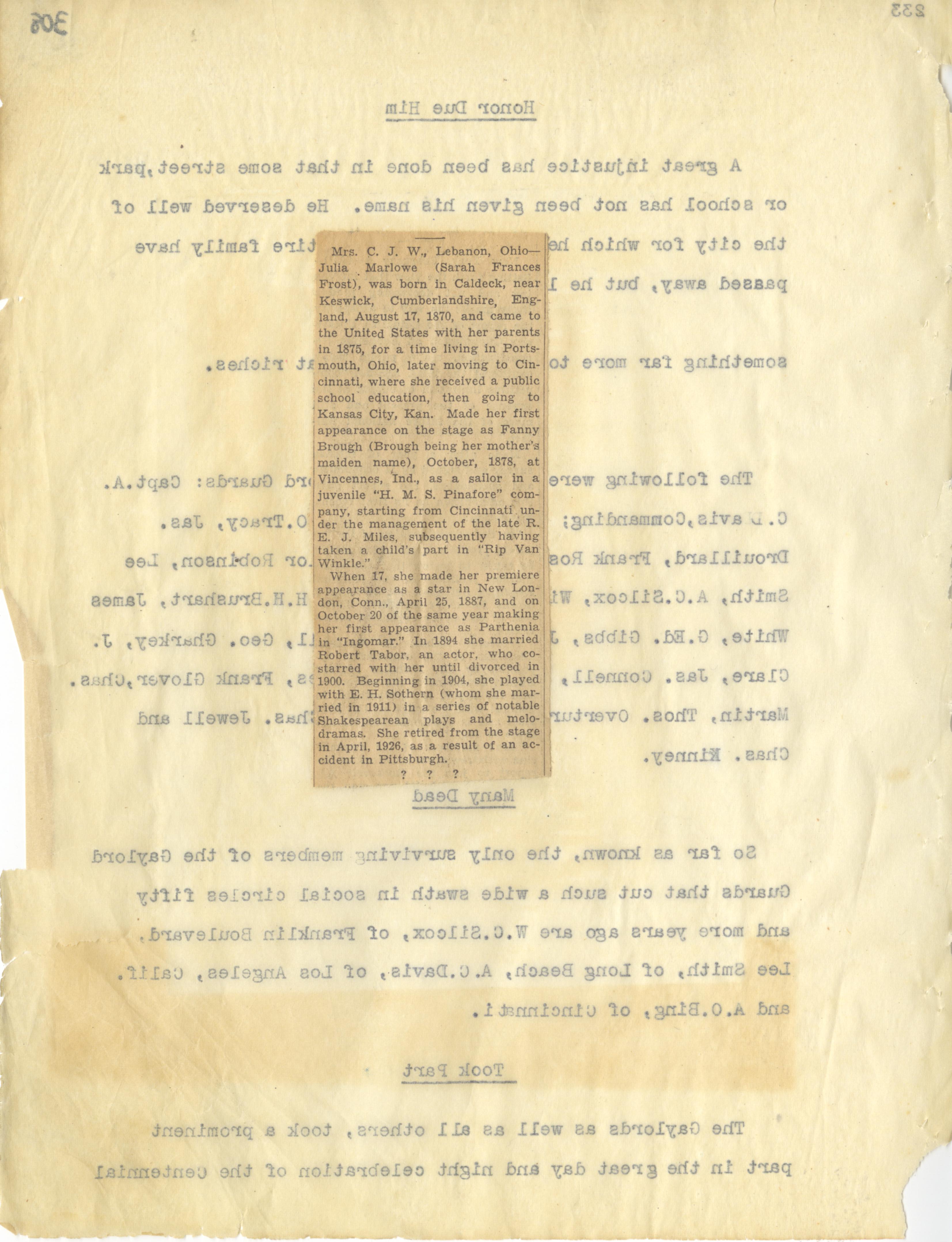 - Photo image of scanned scrapbook page. Pictured is a newspaper article about Mrs. C. J. W. and Julia Marlowe (1870) (1926)