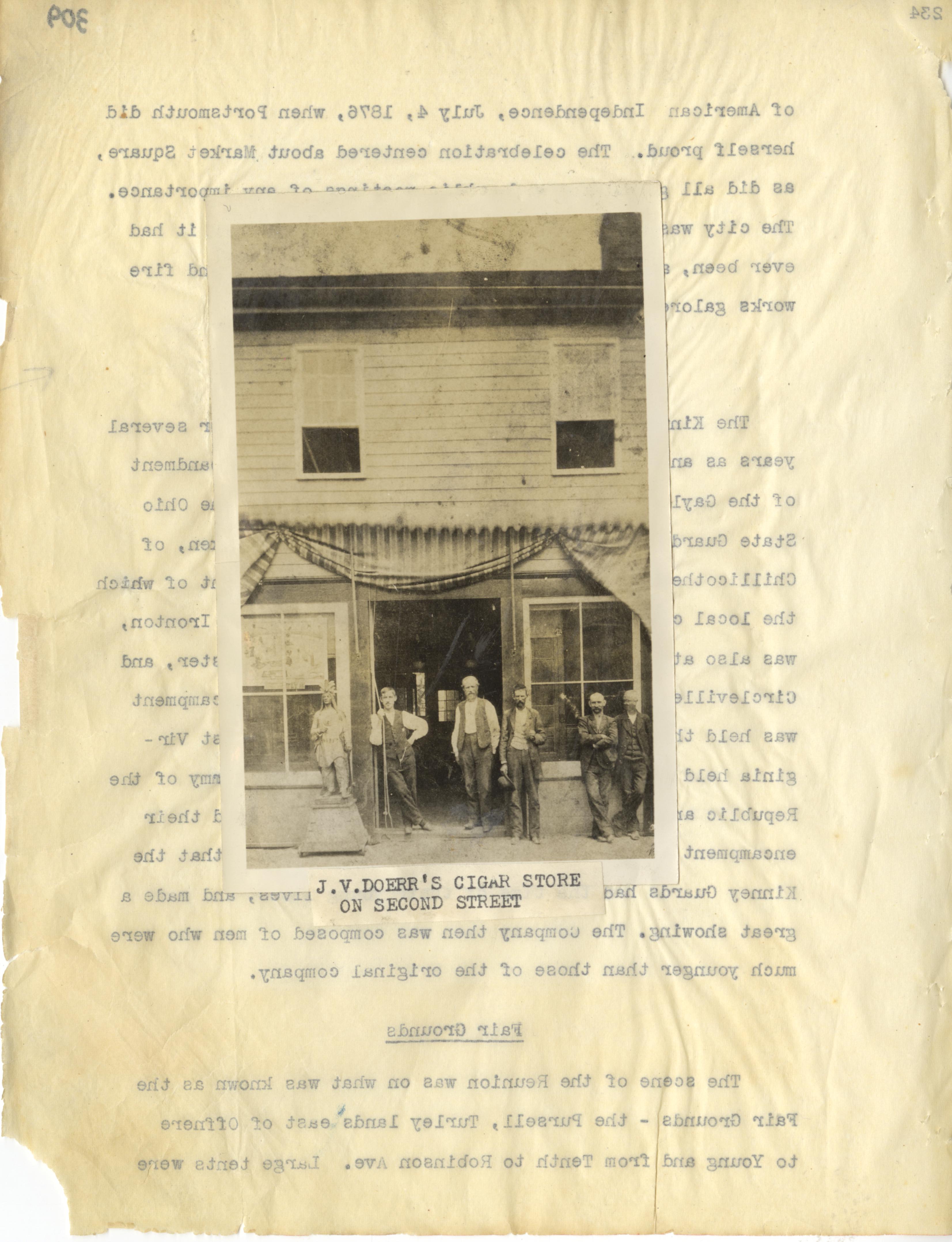 - Photo image of scanned scrapbook page. Pictured is a black and white photo of J. V. Doerr's Cigar Store; Second Street.