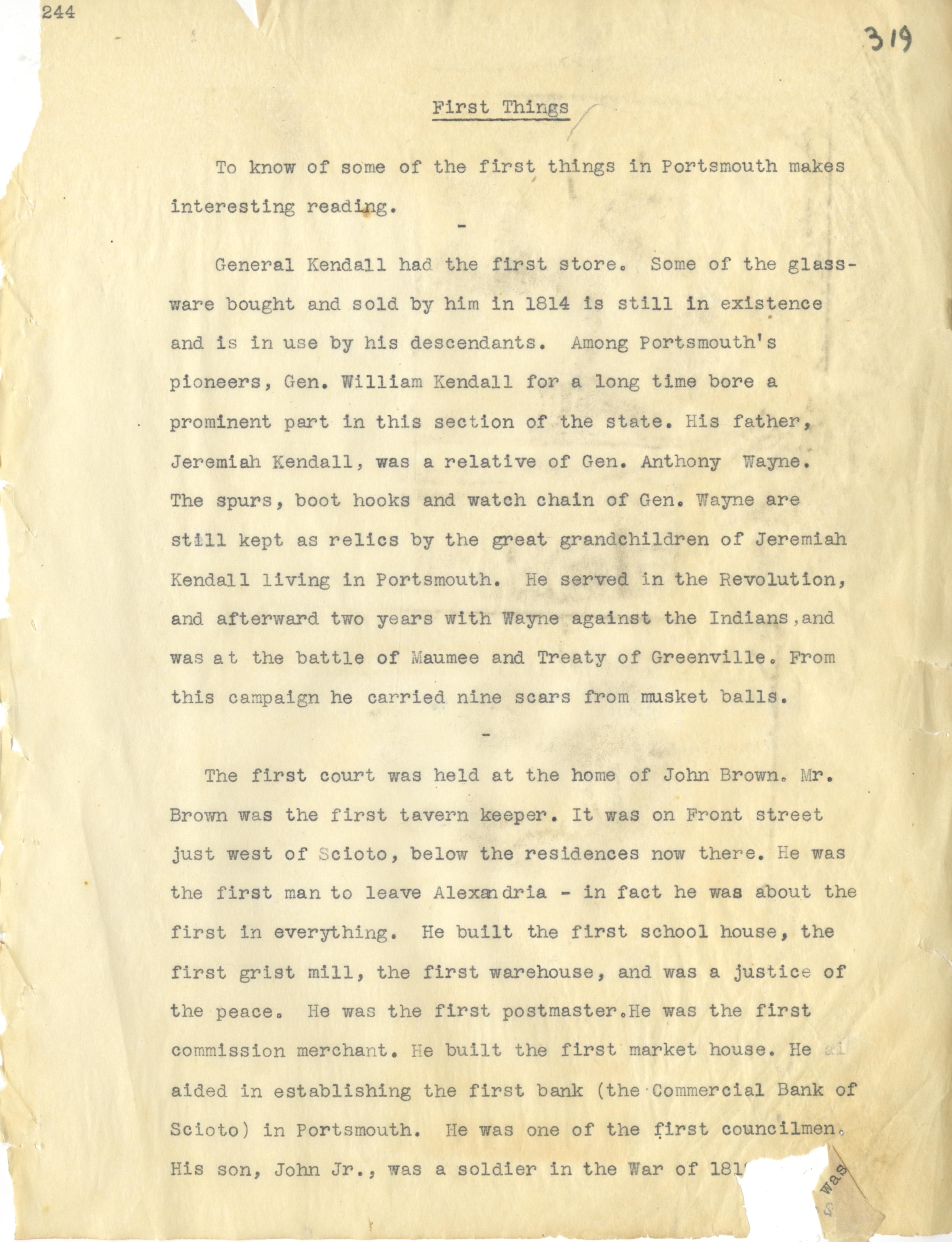 - Photo image of scanned scrapbook page 319. Pictured: First Things; First Store; General Kendall (1814); Jeremiah Kendall; Gen. Anthony Wayne; Battle of Maumee; Treaty of Greenville; First Court; John Brown; Tavern Keeper; Commercial Bank of Scioto; Councilmen; John Jr.; War of 1812