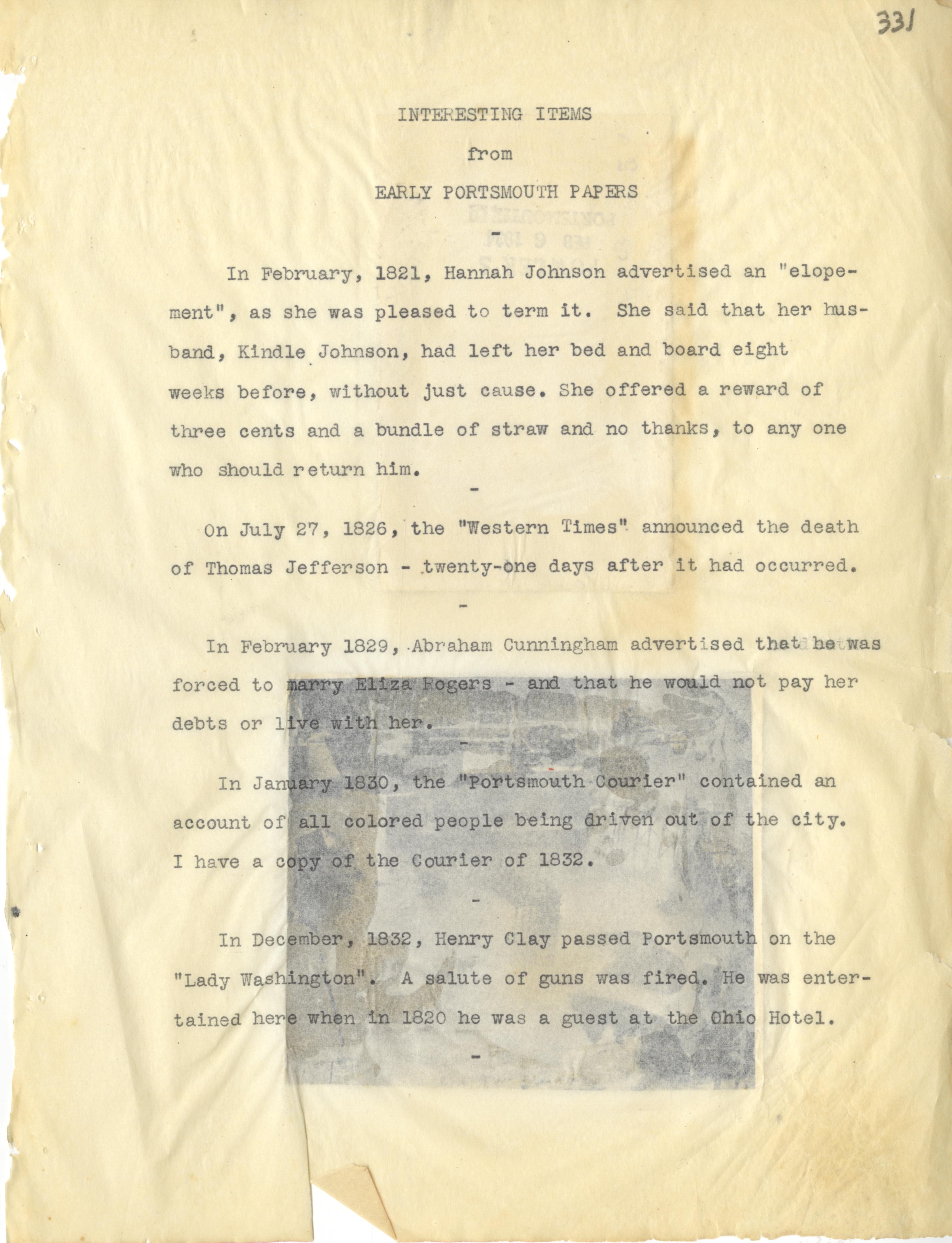 - Photo image of scanned scrapbook page 331. Pictured: Interesting Items from Early Portsmouth Papers; Hannah Johnson (1821); Kindle Johnson; Western Times (1826); Thomas Jefferson; Portsmouth Courier (1830); Henry Clay (1832); Lady Washington; Ohio Hotel (1820)