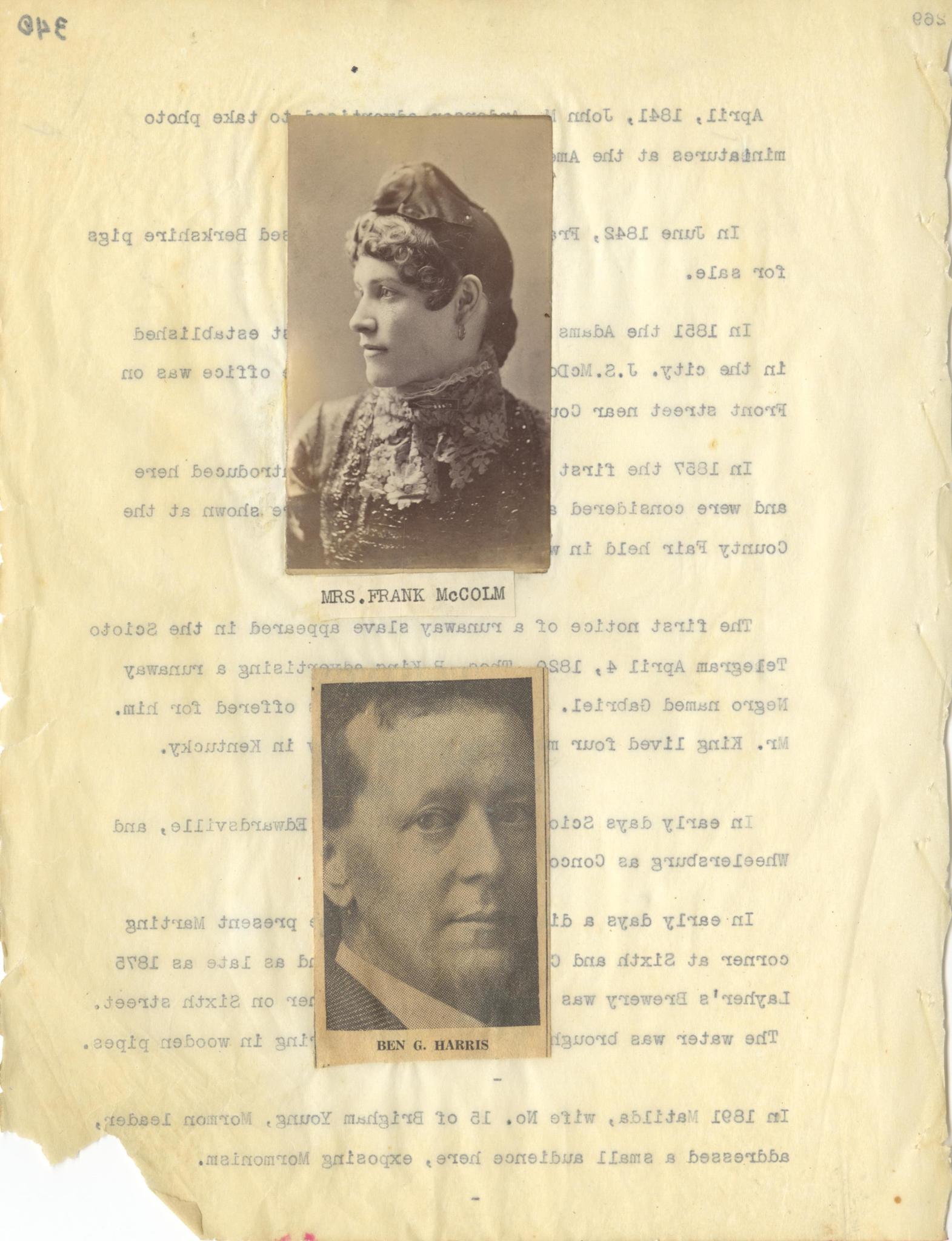 - Photo image of scanned scrapbook page. Mrs. Frank McColm; Ben. G. Harris