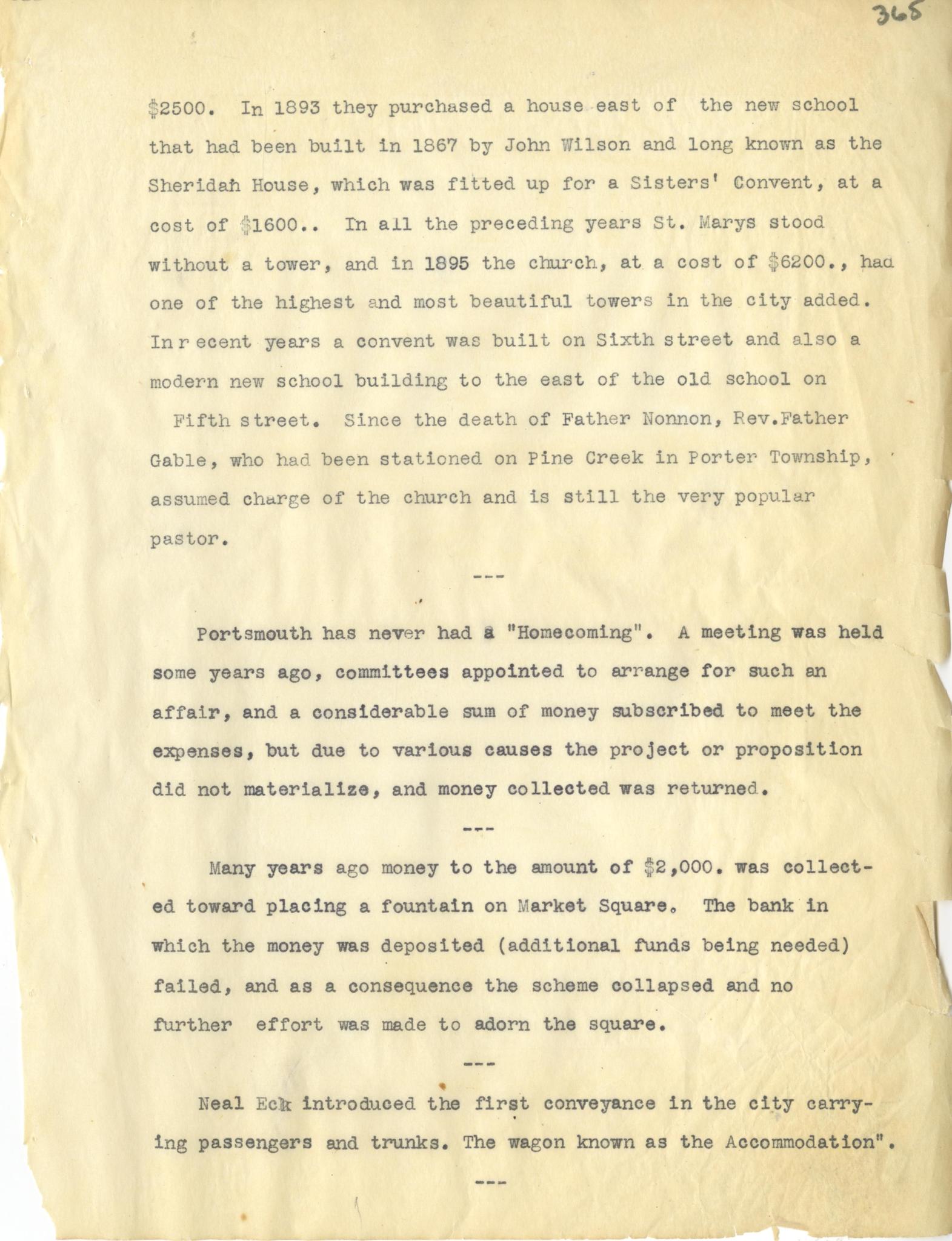 - Photo image of scanned scrapbook page 365. New School (1893); John Wilson (1867); Sheridah House; Sisters' Convent; St. Marys (1895); Father Nonnon; Rev. Father Gable; Pine Creek; Porter Township; Market Square; Neal Eck