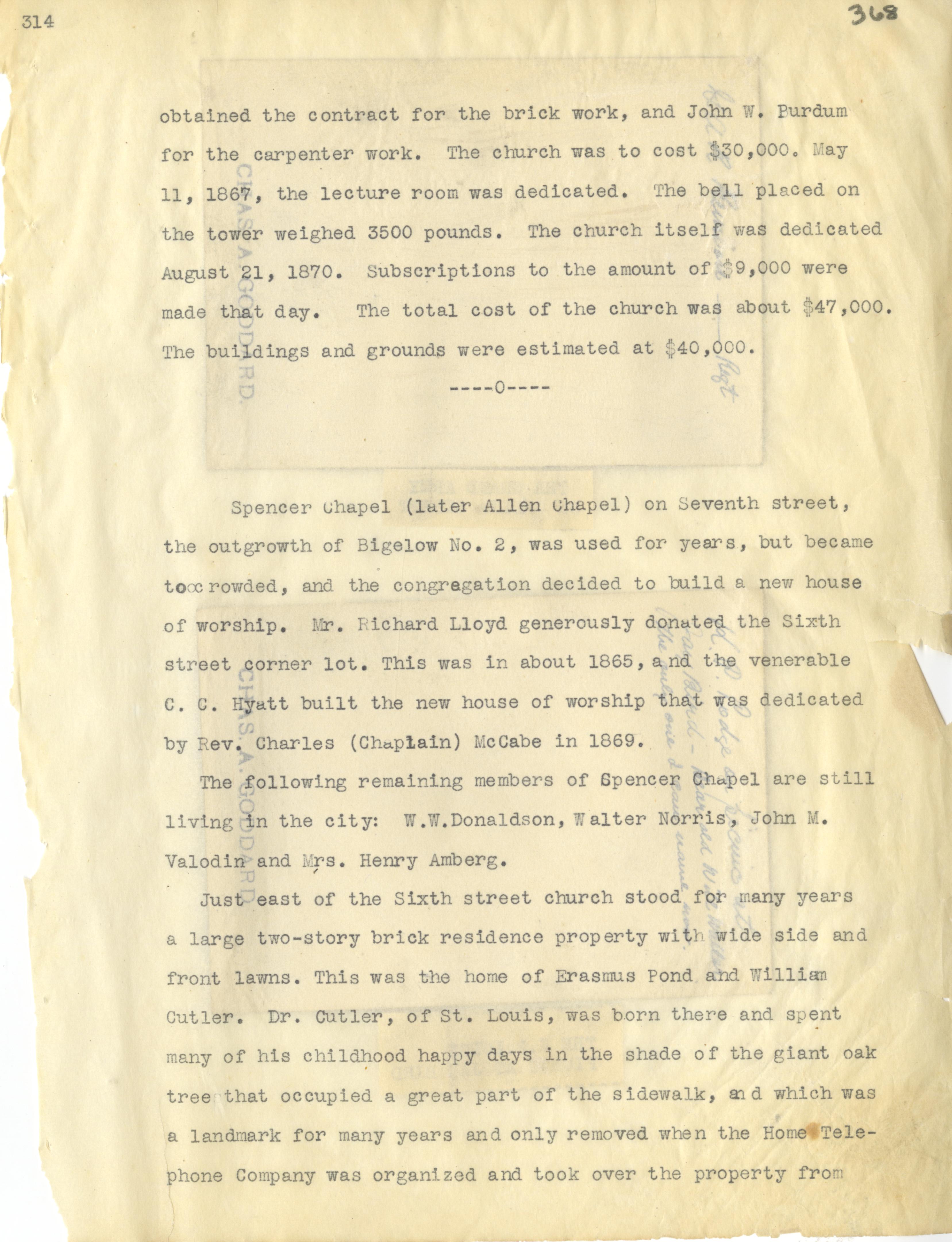- Photo image of scanned scrapbook page 368. John W. Purdum; The Church (1867); Spencer Chapel; Allen Chapel; Bigelow No. 2;Mr. Richard Lloyd; C.C. Hyatt (1865); Rev. Charles (Chaplain) McCabe (1869); W.W. Donaldson; Walter Norris; John M. Valodin; Mrs. Henry Amberg; Erasmus Pond; William Cutler; Home Telephone Company