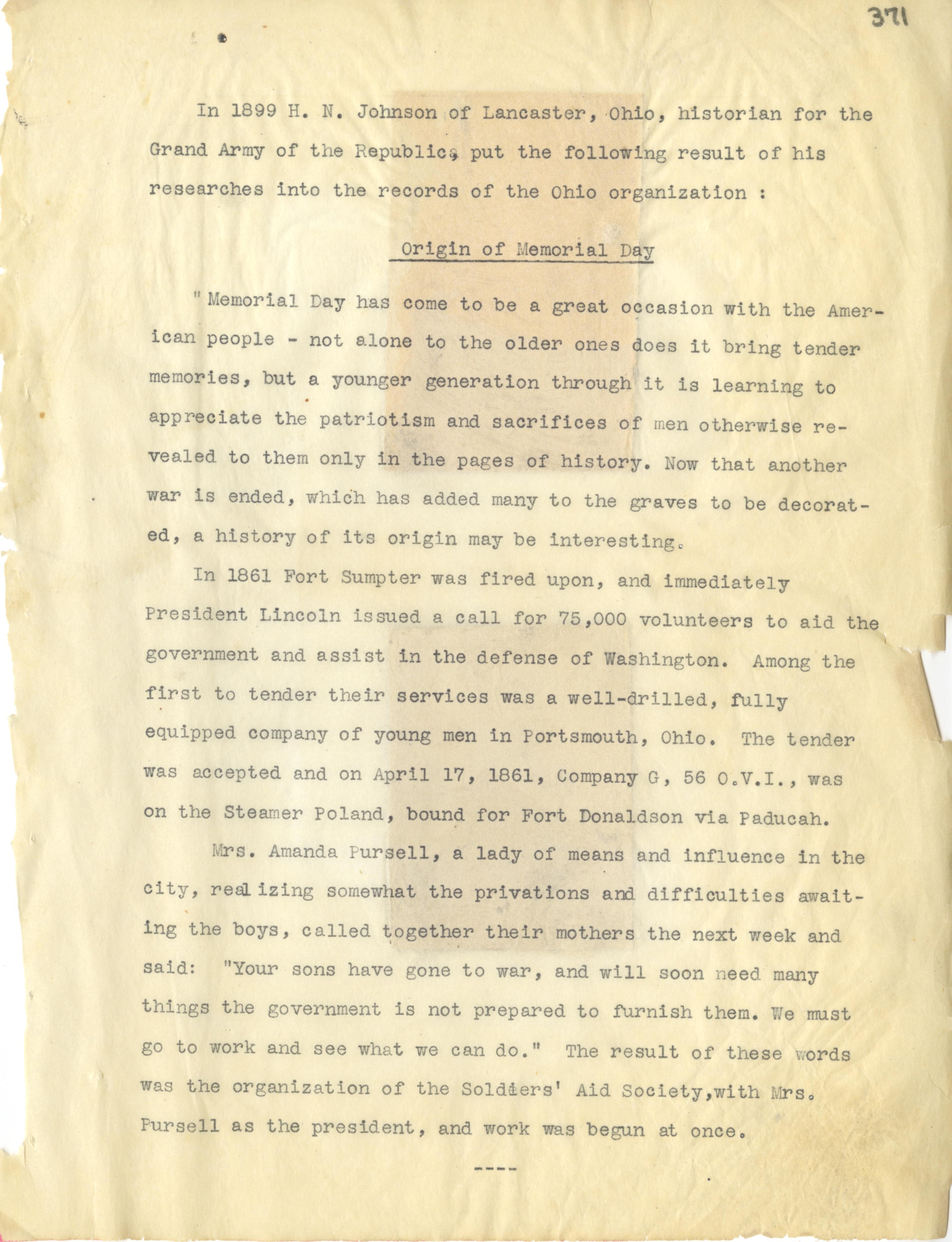 - Photo image of scanned scrapbook page 371. H.N. Johnson (1899); Grand Army of the Republic; Origin of Memorial Day; Fort Sumpter (Sumter) (1861); Company G. 56 O.V.I. (1861); Mrs. Amanda Pursell; Soldiers' Aid Society